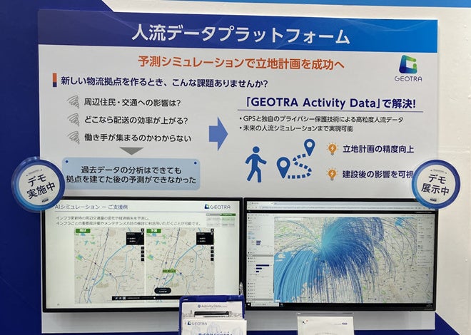 GEOTRAブースでは、人流データをはじめとする位置情報データをもとに構築されたシミュレーション・予測モデルのデモンストレーションを中心に展示しました。