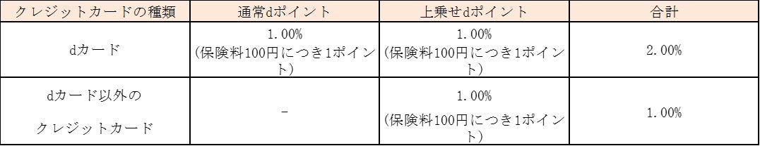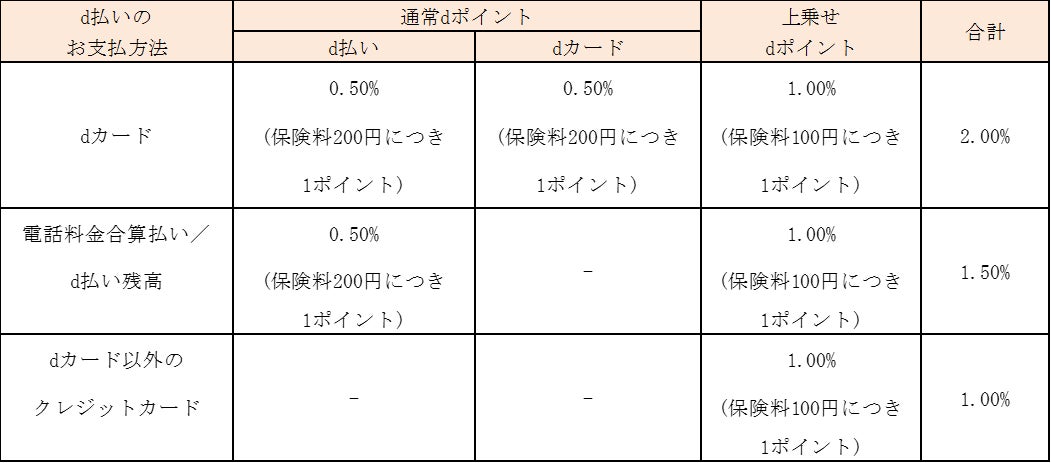 保険料(dポイント利用分を除く)に対して、通常のdポイントに加えて1.0%のdポイントを上乗せして進呈します。これにより、「d払い」または「dカード」でお支払いの場合は、合計して最大2.0%のdポイントがたまります。