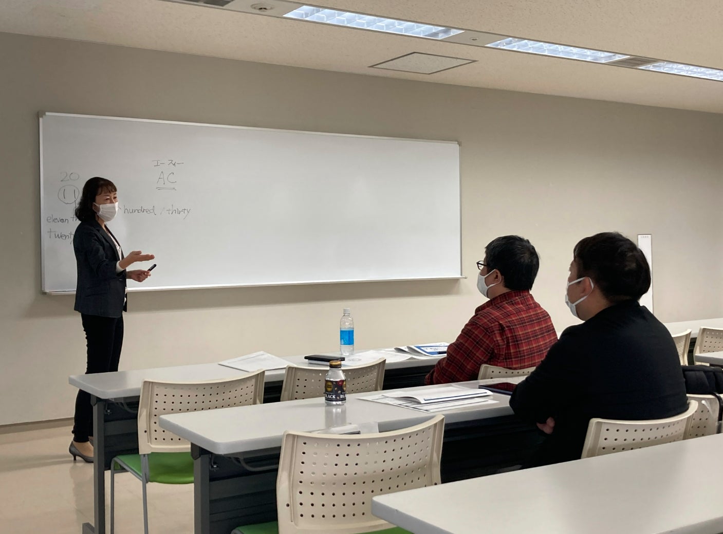 後半は(株)ライフブリッジ東京営業所長 堀岡三佐子氏をゲスト講師に迎え、訪日外国人旅行者の特長や簡単カタカナ接客英語でのコミュニケーションに関する講義・実習が行われました。