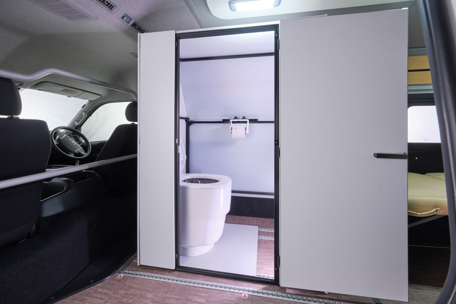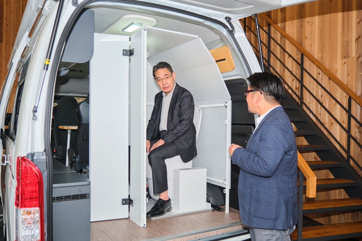 その後、脱着式機能も備えた、クレサナトイレのポータブルタイプや、個室ユニットの量産型として開発を行い、マルモビ車両に手軽に搭載できる追加オプションが完成。トイレモードも実現が可能となりました。