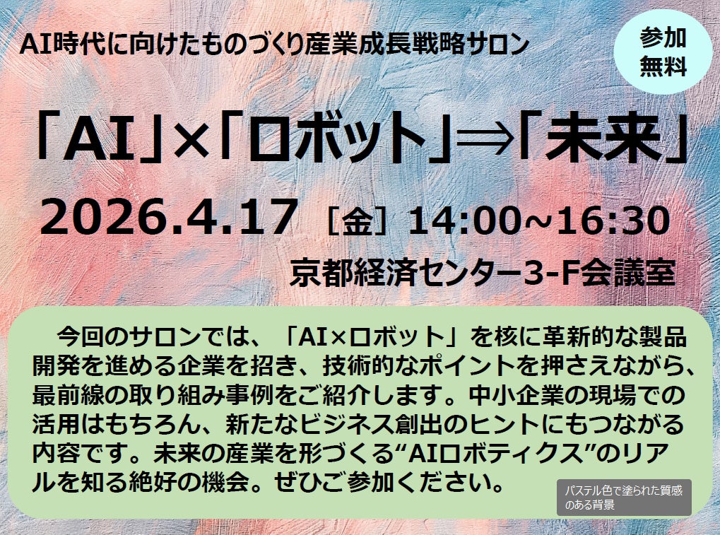 今回の「AI時代に向けたものづくり産業成長戦略サロン」は、「AI」×「ロボット」⇒「未来」をテーマに、京都府内のものづくり企業を対象として開催されるイベントです。最新のAIロボットに関する情報を提供し、事業革新を促す学びの場として、AIやロボットの進化が現場にもたらす変化や、新たなビジネス創出のきっかけとなるイノベーションプロセスを紹介します。