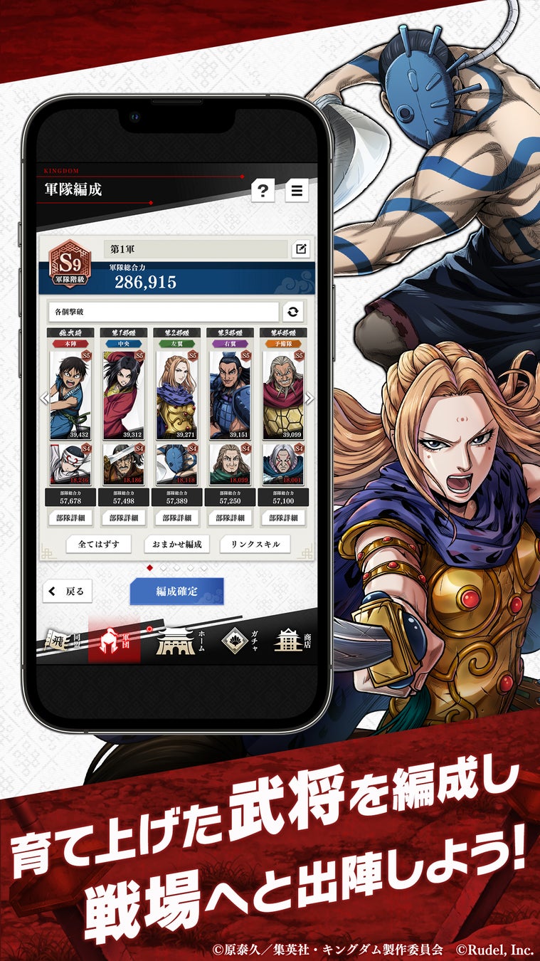 本ゲームはキングダムのオリジナルソーシャルゲーム6本目の作品となる、育成シミュレーションゲームです。主人公は練兵家となり『キングダム』に登場する武将たちを獲得、育成し、育成した武将たちを率いて最強の軍隊を編成、並み居る強敵を討ち倒し中華の『頂天』を目指します。