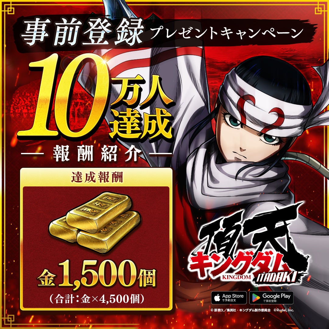 株式会社ルーデル(本社:東京都新宿区、代表取締役:和泉 晴)は、アニメ『キングダム』を題材とするスマホゲーム『キングダム 頂天』の事前登録者数が7万人を突破したことをお知らせいたします。