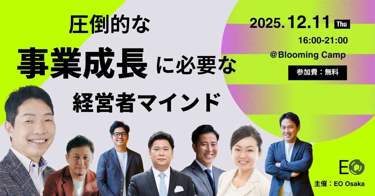 一般社団法人EO Osaka(所在地:大阪府大阪市、以下EO大阪)は、2025年12月11日、大阪市内(Blooming Camp)にて、気鋭の経営者たちが登壇する講演イベント「圧倒的な事業成長に必要な経営者マインド」を開催いたしました。