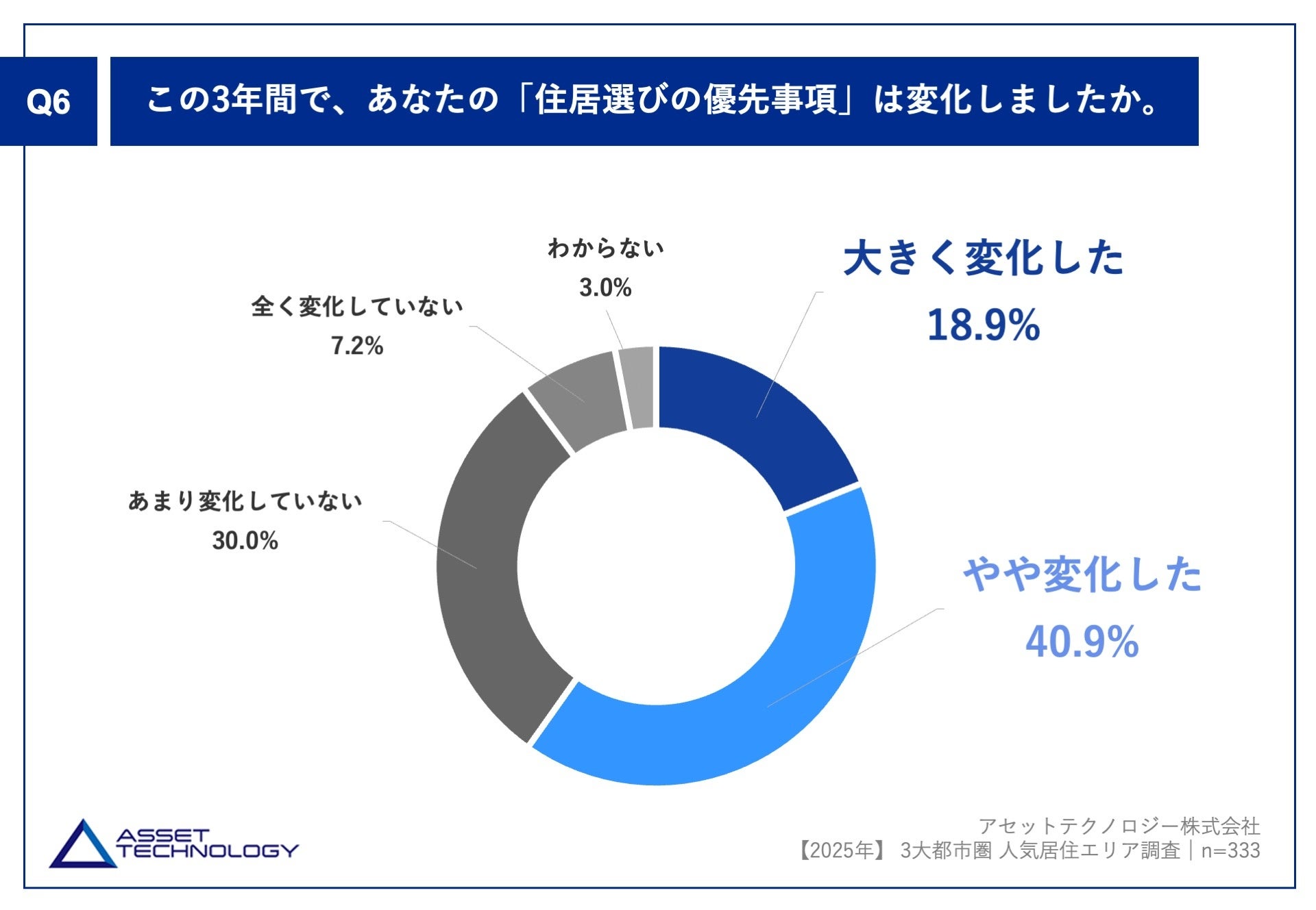 「Q6.この3年間で、あなたの「住居選びの優先事項」は変化しましたか。」(n=333)と質問したところ、「大きく変化した」が18.9%、「やや変化した」が40.9%という回答となりました。