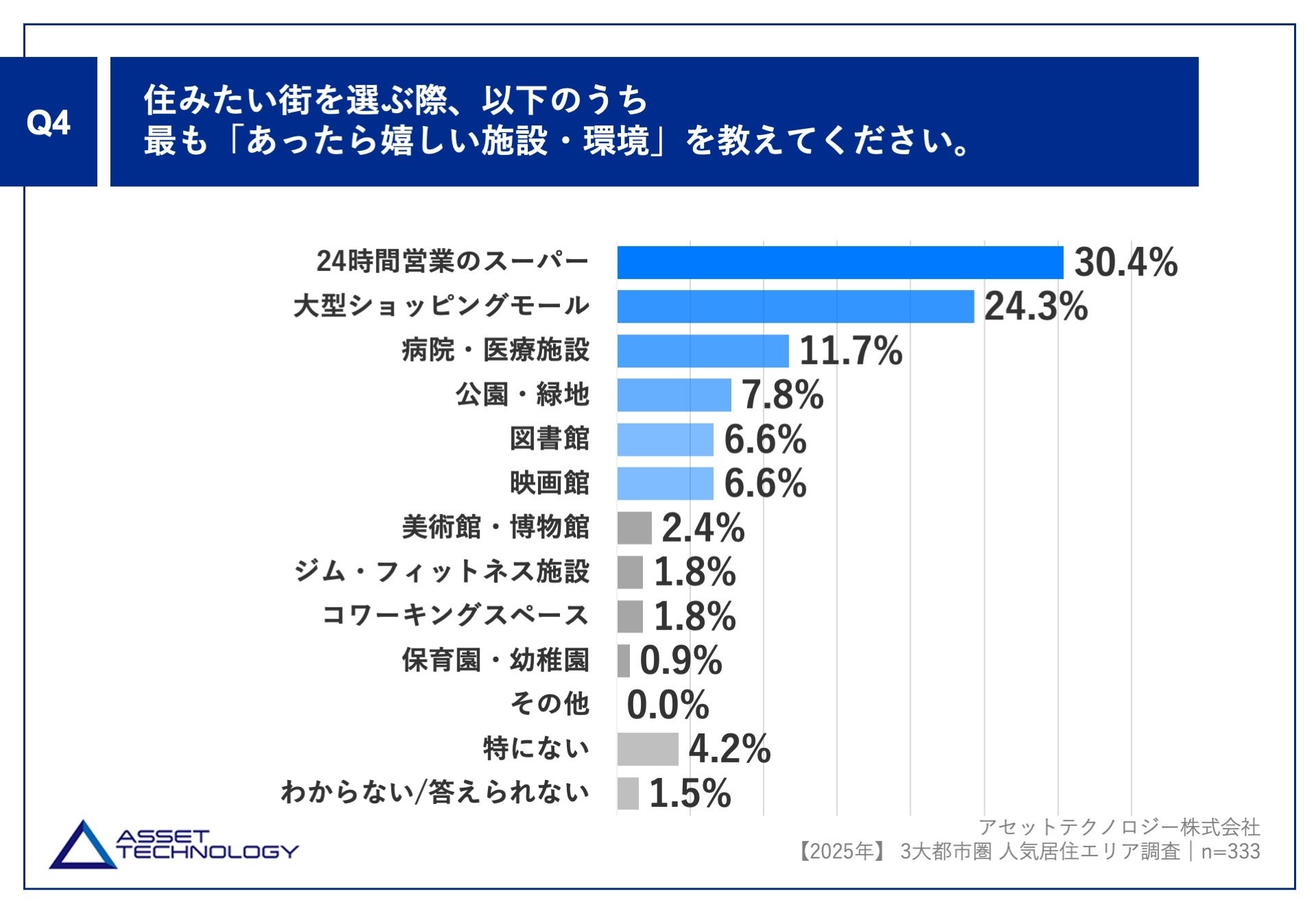 「Q4.住みたい街を選ぶ際、以下のうち最も「あったら嬉しい施設・環境」を教えてください。」(n=333)と質問したところ、「24時間営業のスーパー」が30.4%、「大型ショッピングモール」が24.3%、「病院・医療施設」が11.7%という回答となりました。