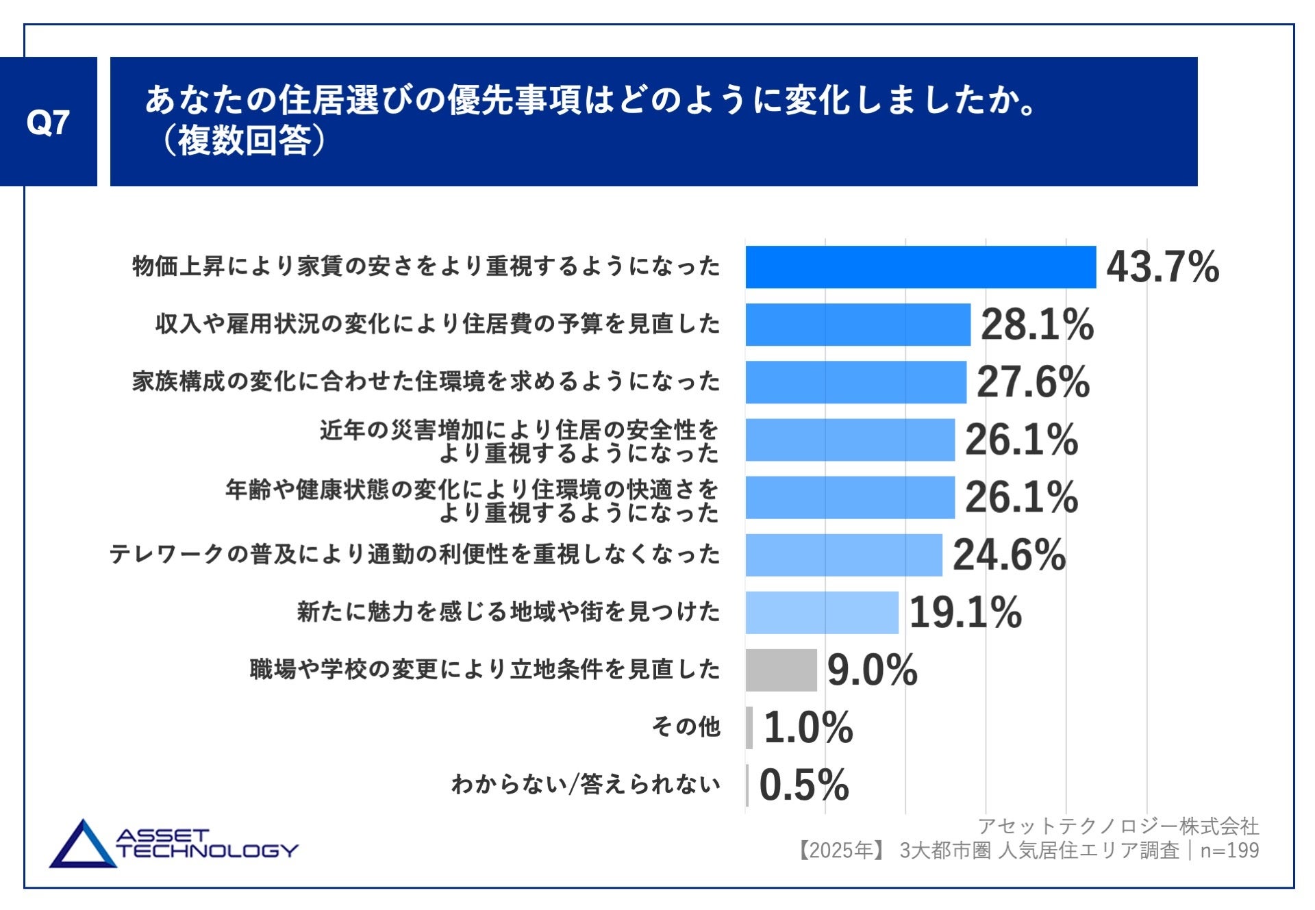 Q6で「大きく変化した」「やや変化した」と回答した方に、「Q7.あなたの住居選びの優先事項はどのように変化しましたか。(複数回答)」(n=199)と質問したところ、「物価上昇により家賃の安さをより重視するようになった」が43.7%、「収入や雇用状況の変化により住居費の予算を見直した」が28.1%、「家族構成の変化に合わせた住環境を求めるようになった」が27.6%という回答となりました。