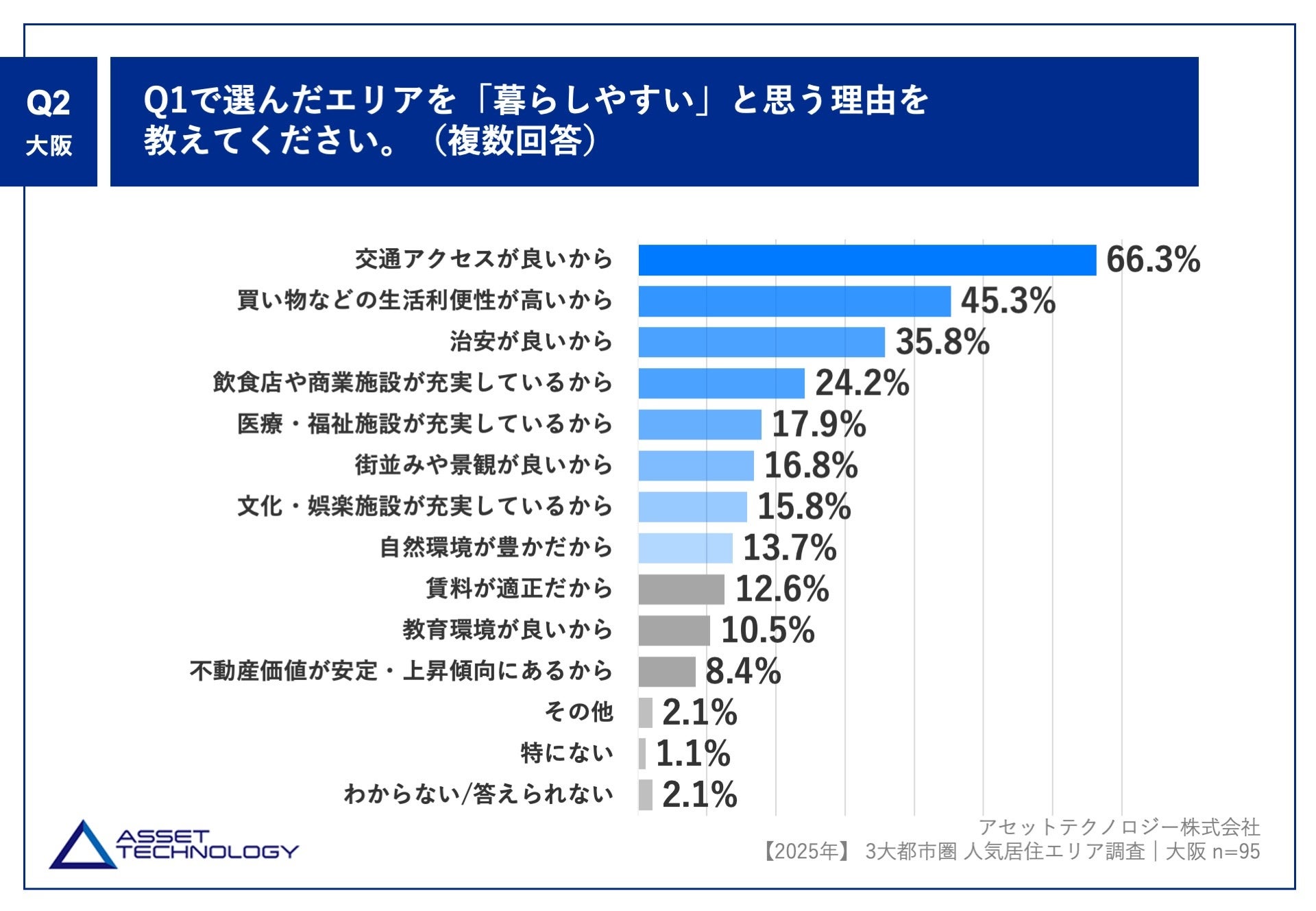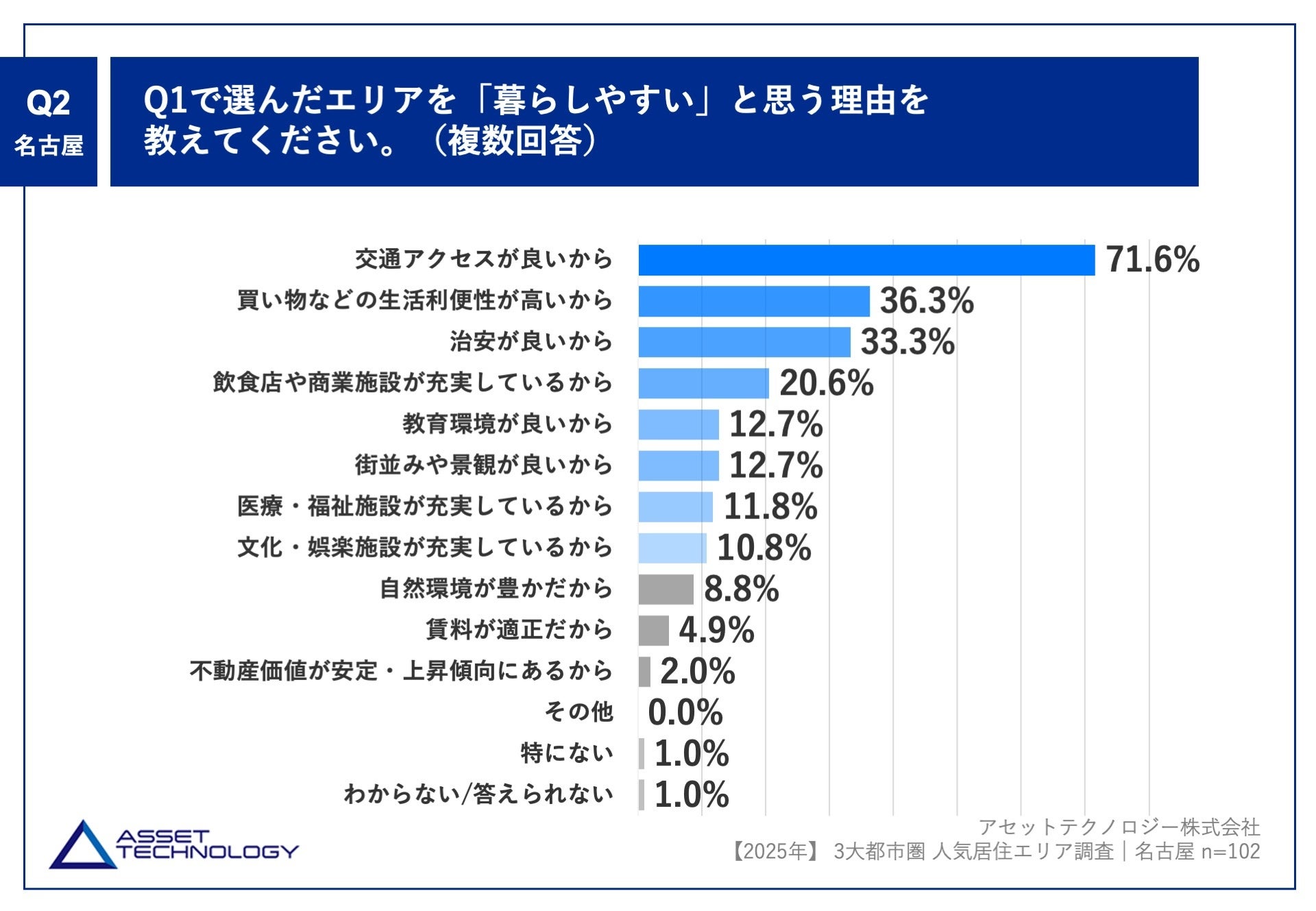 Q1で「特にない」「わからない/答えられない」以外を回答した方に、「Q2.Q1で選んだエリアを「暮らしやすい」と思う理由を教えてください。(複数回答)」と質問したところ、東京(n=102)は「買い物などの生活利便性が高いから」が58.8%、大阪(n=95)は「交通アクセスが良いから」が66.3%、名古屋(n=102)は「交通アクセスが良いから」が71.6%という回答となりました。