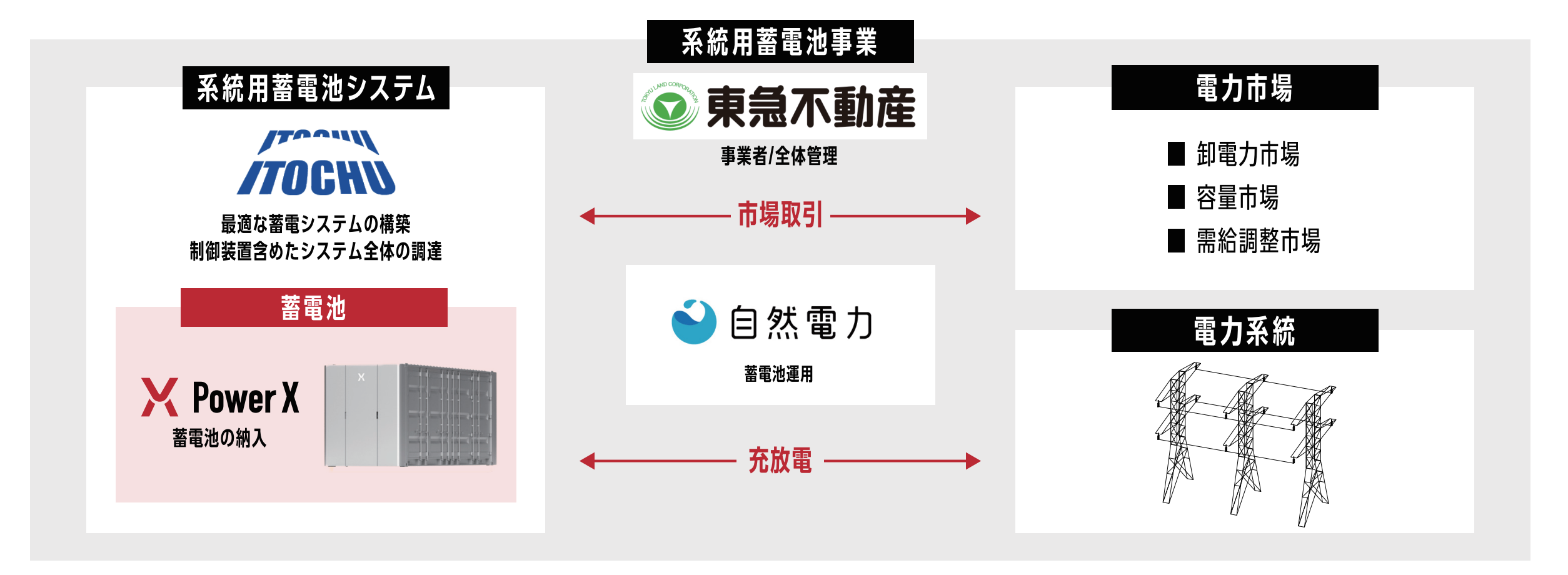 また、本事業においては、東急不動産、伊藤忠商事株式会社(本社:東京都港区、代表取締役社長 COO:石井 敬太、以下「伊藤忠商事」)、パワーエックス及び自然電力株式会社(本社所在地:福岡県福岡市、代表取締役:磯野謙、川戸健司、長谷川雅也、以下、「自然電力」)の 4 社が、本事業の推進および系統用蓄電池事業の拡大に向けたパートナーシップ契約を締結いたします。