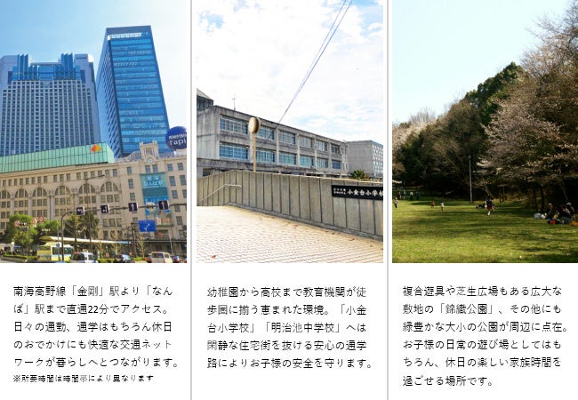 南海高野線「金剛」駅徒歩圏、難波まで直通22分の軽快なフットワークに加え、周辺には日々の暮らしを充実させてくれる施設が点在。多彩なショッピング施設や、毎日を豊かにしてくれる公園や自然環境、そして家族の健康に欠かせない医療機関や公共施設も充実しています。