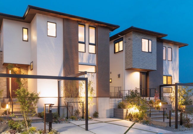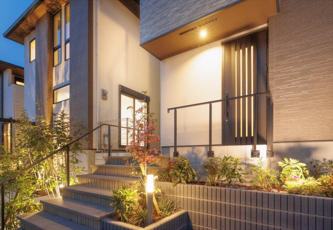 フィアスコート金剛TSUZUYAMAの街並みは、YKKAPが毎年開催しているエクステリアスタイル大賞でベストスタイル賞を受賞しました。敷地の高低差から生まれるアプローチ階段を美しく見せるよう植栽や照明を配置し、
