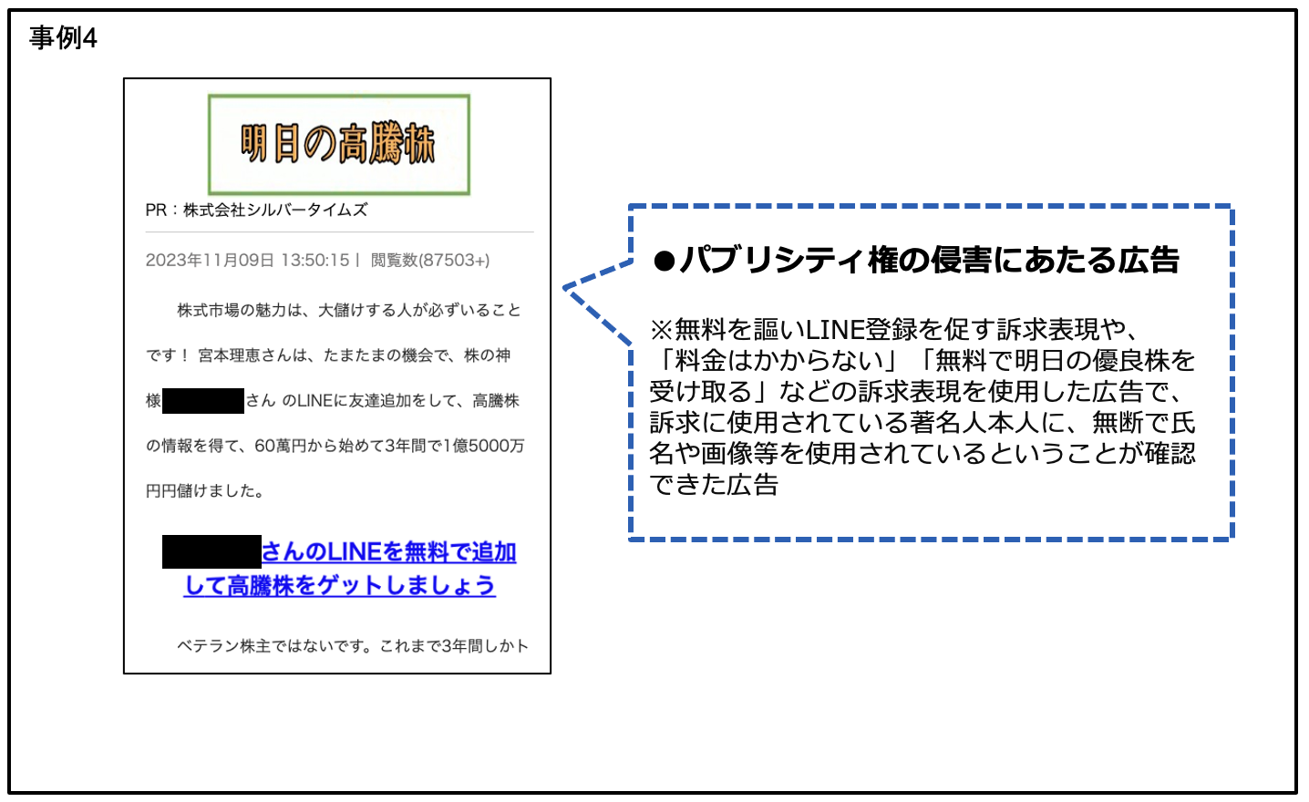 a. パブリシティ権の侵害にあたる広告(著名人の名前や画像等を無断利用していることが明確に判明している広告)