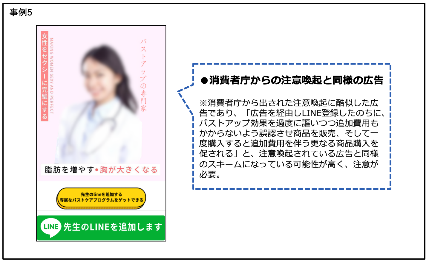 b. 【追加指摘】過度の痩身効果もしくはバストアップ効果、並びに追加費用がかからない旨を謳い、LINE登録を勧誘する広告(消費者庁が注意喚起している内容に酷似した広告)