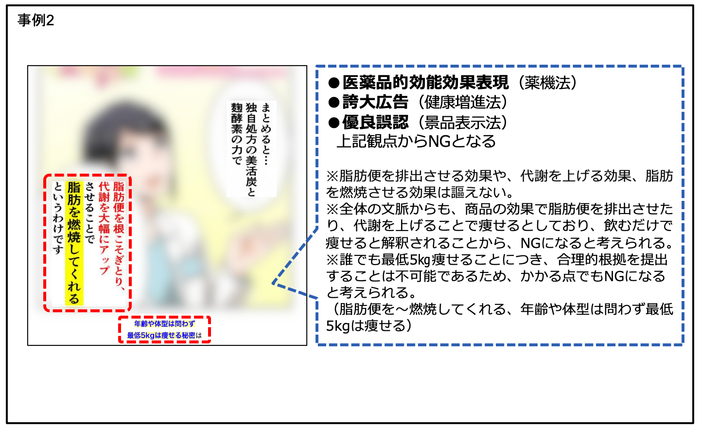 例:必ず痩せることができる、脂肪便を排出させる、代謝を上げてくれる、脂肪を燃焼させる、痩せ体質になれる、2週間で13.1kgの減量、BA画像との組み合わせで過度に痩せるような表現
