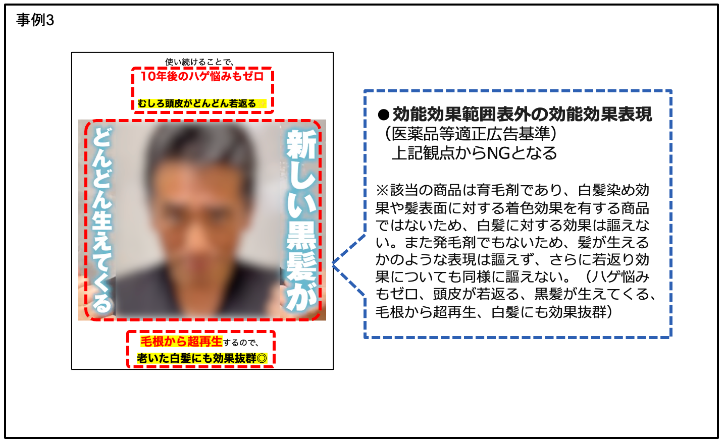 例6:育毛剤において、塗る植毛、誰にもバレずに生やせる、などの表現や、BA画像により、あたかも髪が生えるかのような表現。また白髪が生えてこなくなる、白髪ケア、などの白髪に効果があるかのような表現。
