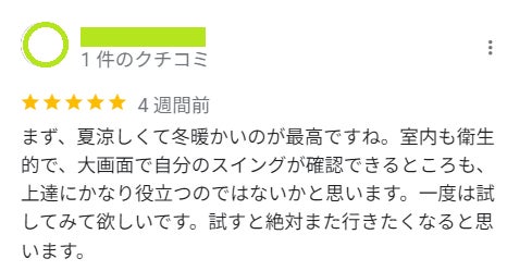 口コミ評価★4.28/5!猛暑でもスポーツは楽しめる!インドア環境で涼みゴルフ
