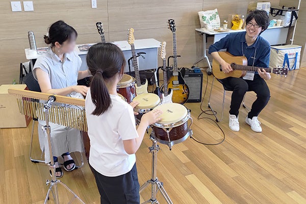 中にはギター経験者のお父さんや、吹奏楽部でパーカッション担当の中学生など経験者も参加。私たちも演奏のコツを伝授するなど楽器体験を超えたレッスンさながらの場面も見られました。