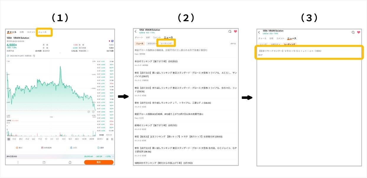 (1) 銘柄名、銘柄コード等から各銘柄のページに入ります。 上部の「ニュース」をタップしてください。