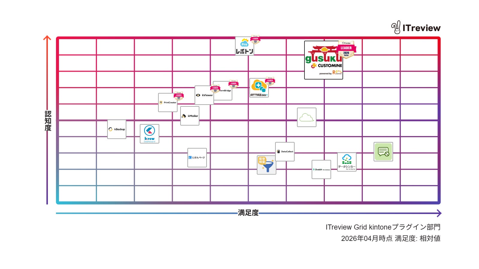「kintoneプラグイン部門」において、顧客満足度と認知度の双方が優れた製品として評価され、最高位の称号である「Leader」を受賞しました。