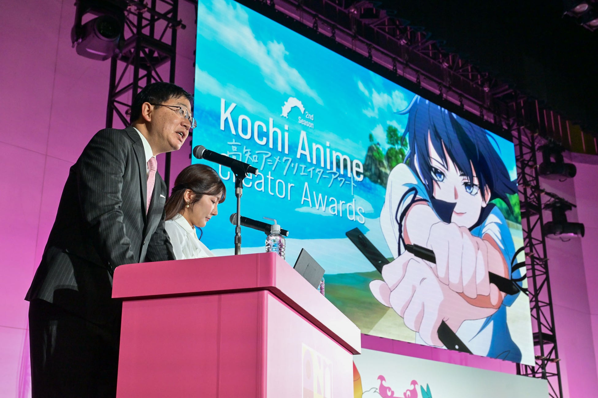 アニ魂のプレゼンターは、高知アニメクリエイター聖地プロジェクト実行委員会、高知信用金庫の山﨑久留美理事長、スタジオエイトカラーズの宇田英男代表取締役、吉本3Dファクトリーの吉本大輝代表取締役でした。