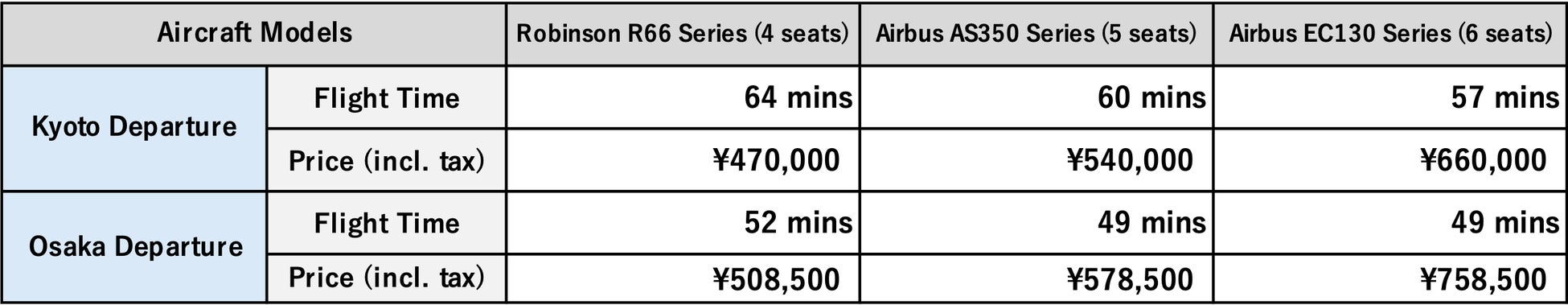 From ¥117,500 (tax included) per person (4-passenger helicopter: from ¥470,000 per flight / 5-passenger: from ¥540,000 / 6-passenger: from ¥660,000)