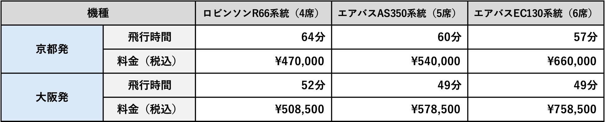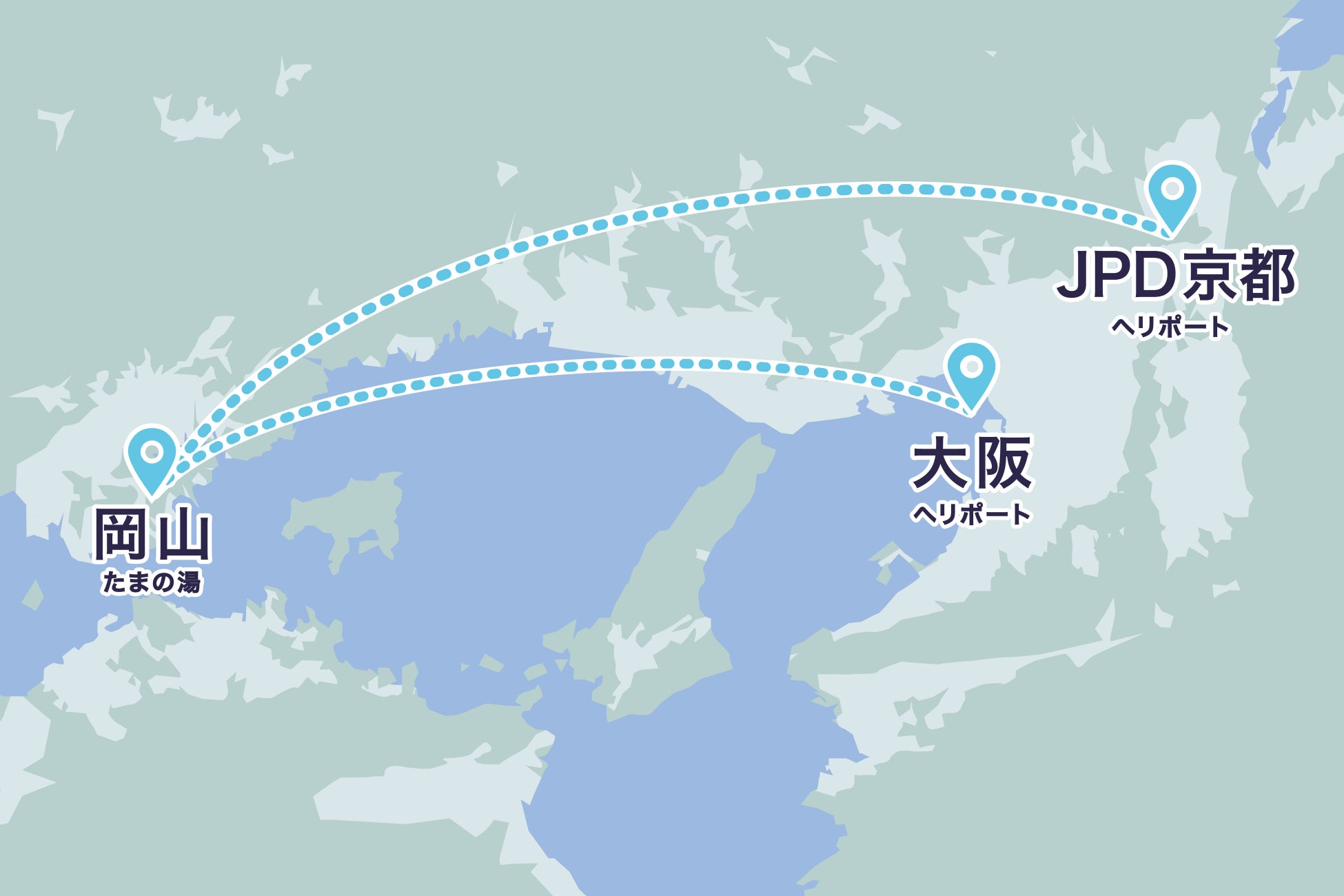 区間:「JPD京都ヘリポート」または「大阪ヘリポート」⇆「岡山・瀬戸内温泉たまの湯場外離発着場」
