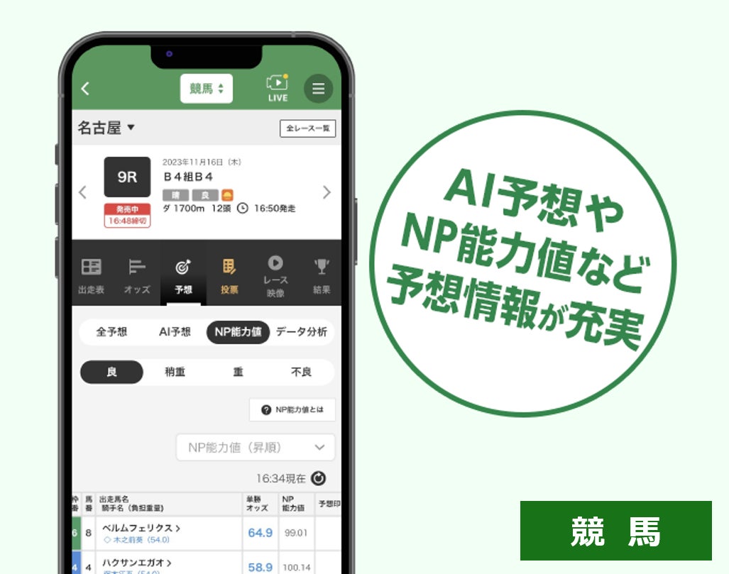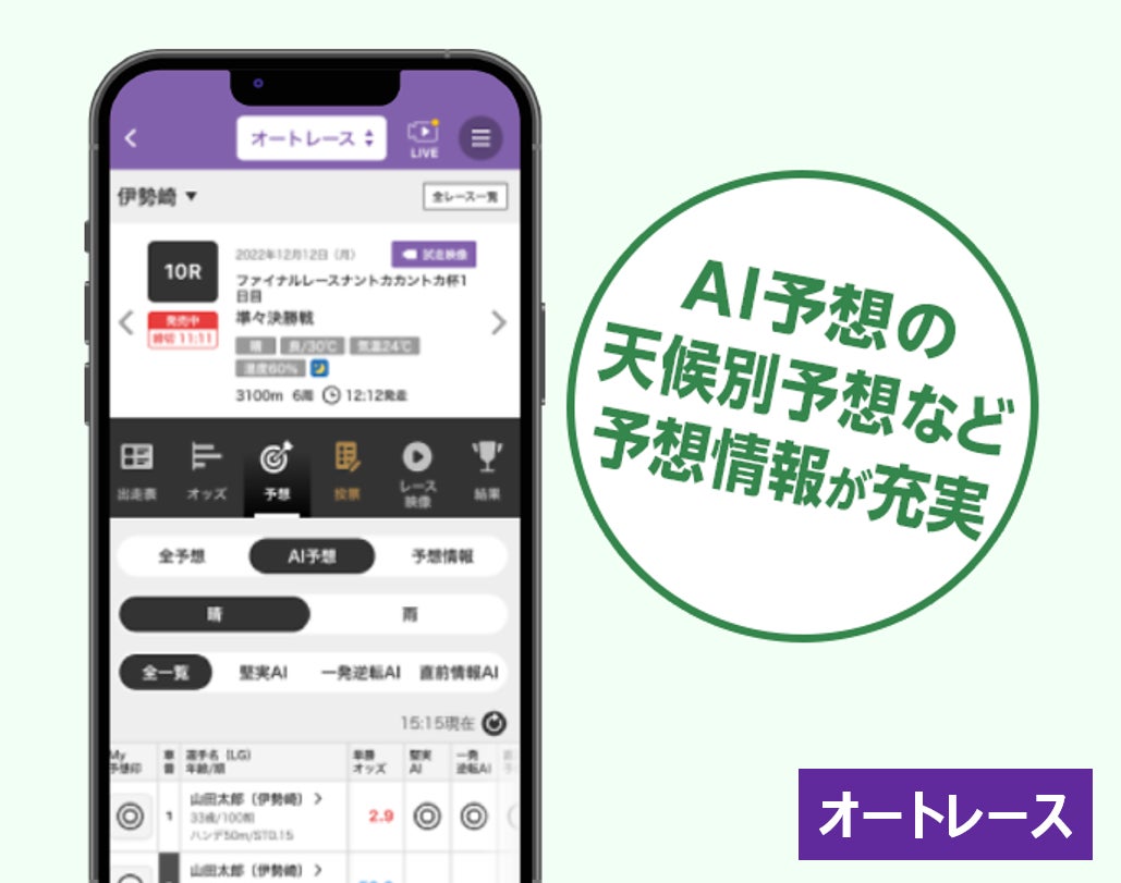 過去のレース情報や、競走馬・騎手・選手のパフォーマンスなどを学習した「AI予想」を活用すれば、初心者の方でも簡単に回収率重視や穴狙いなどの目的に合わせて投票できます。さらに、AIが予想した予想印から買い目を設定できるので、スムーズに投票することが可能です。