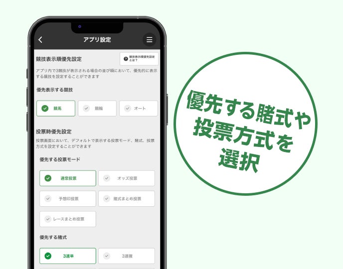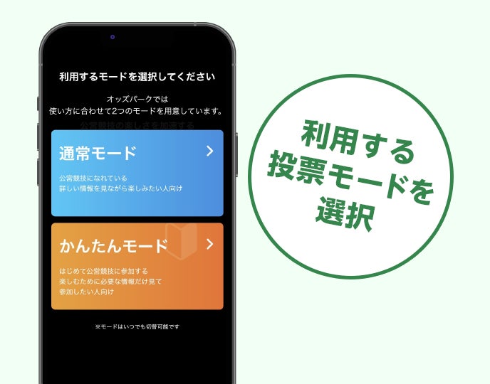 ご自身の投票スタイルに合わせて、投票画面を「通常モード」と「かんたんモード」の2種類から選択いただけるようになりました。さらに、お好みの競技や賭式を優先表示として設定することで、誰でも簡単に投票をお楽しみいただけます。