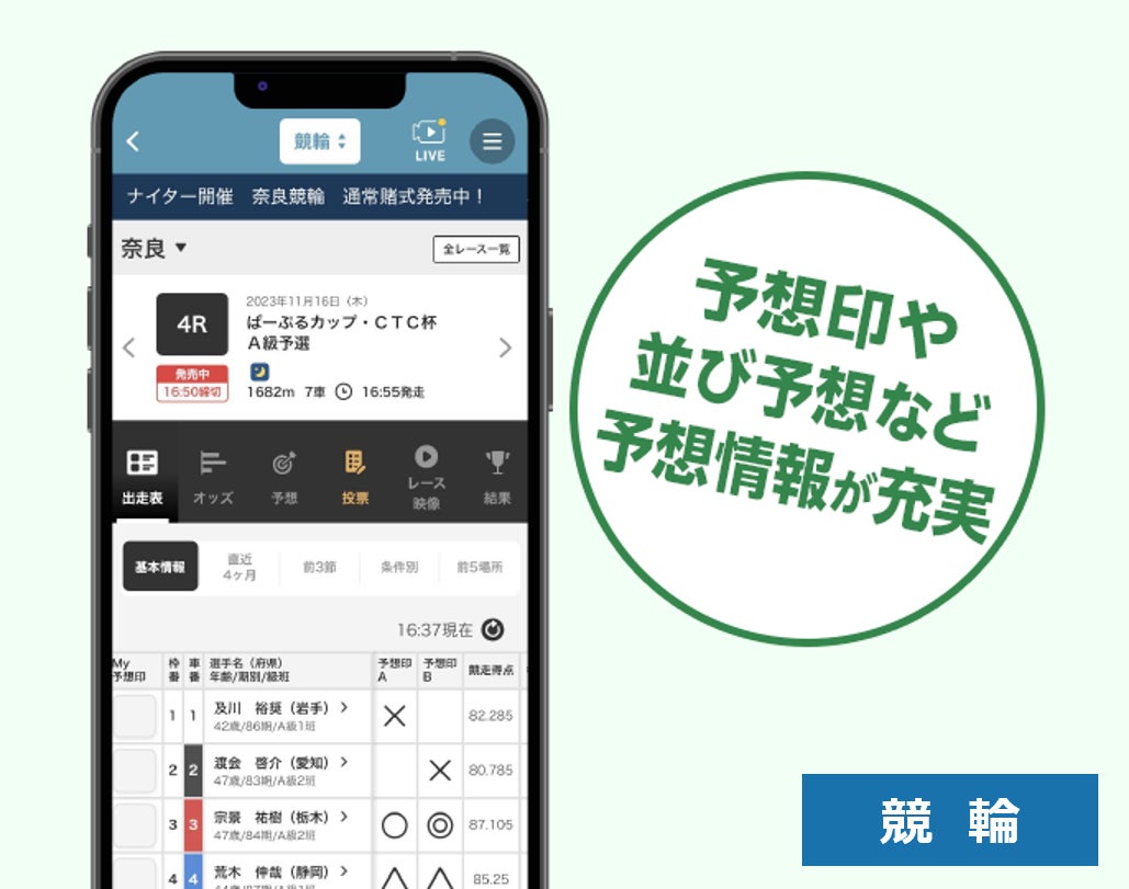 リニューアルしたアプリでは、初心者の方から上級者の方まで、皆さまにご自身のスタイルに合わせて公営競技をお楽しみいただけるよう、投票画面と投票機能の利便性を改良し、予想やレースなどの情報も見やすく、さらに使いやすくパワーアップいたしました。