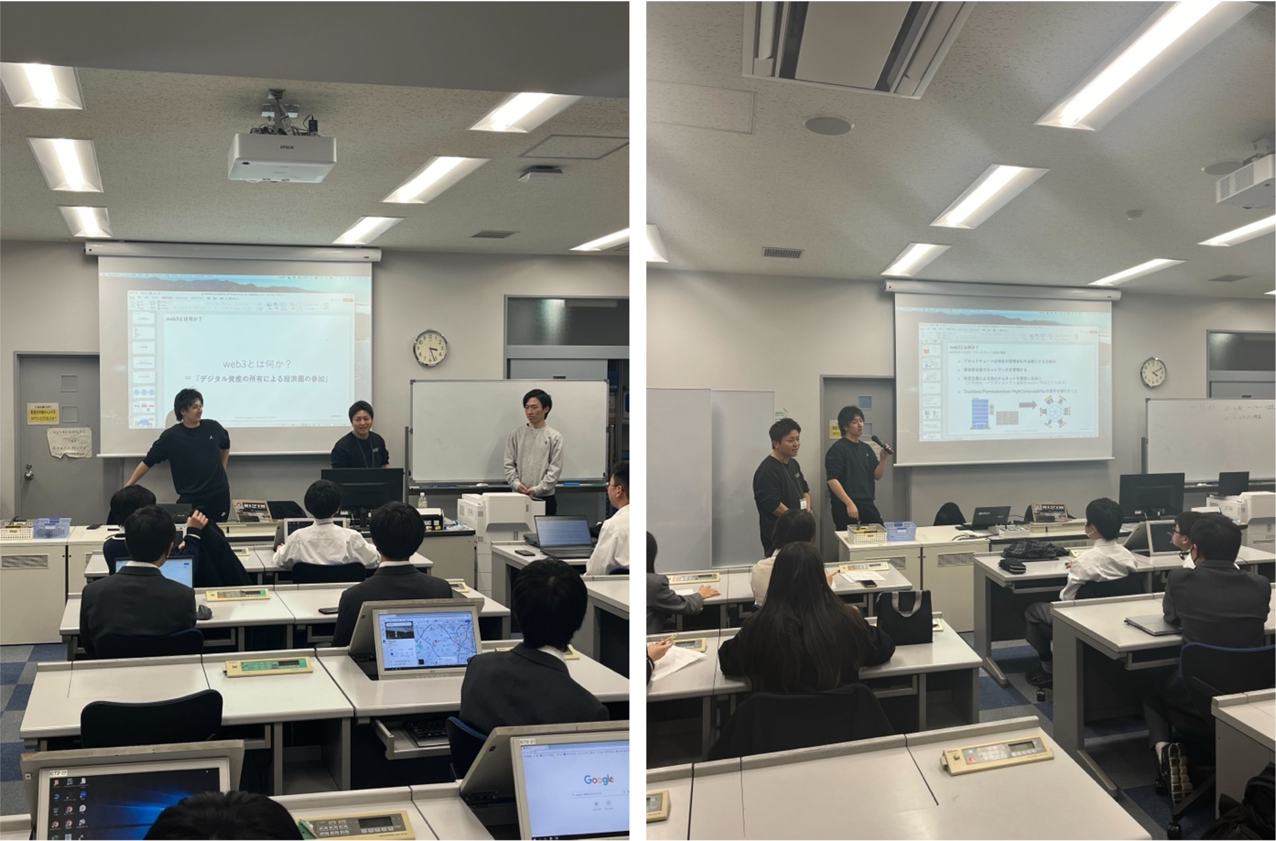 プログラムは大きく二部構成で実施されました。第一部では、共同代表の小野と佐藤によるプレゼンテーションを実施しました。web3・ブロックチェーンについて聞いたことはあるが、その具体的な仕組みについては分からないという参加者が大多数を占めていました。業界の最前線で活躍するプロフェッショナルによる講座に、参加者も興味津々でした。