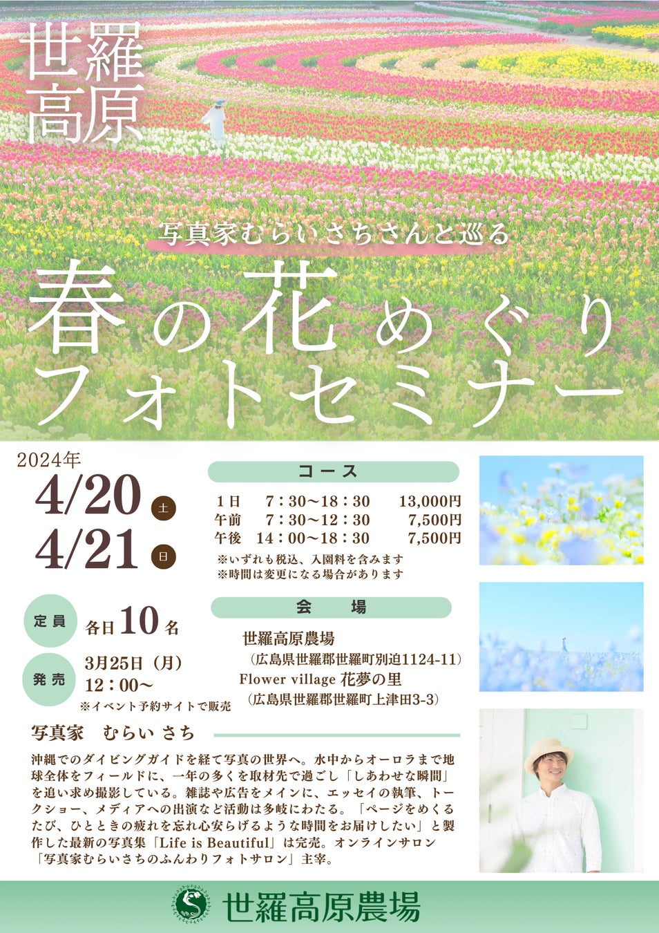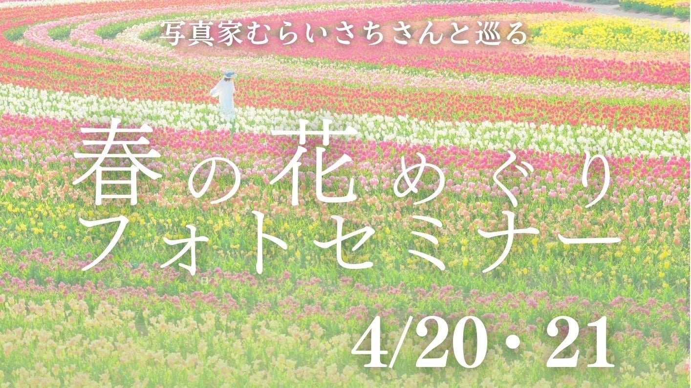 写真家むらいさちさんと一緒に世羅高原農場・Flower village 花夢の里を巡って春の花を撮影するフォトセミナーです。世羅高原農場を季節ごとに訪れるむらいさちさんオススメのスポットで一緒に撮影しながら、カメラの設定や構図などのレクチャーを受けることができます。むらいさちさんの「ゆるふわ」写真のテクニックを一緒に楽しく撮影しながら学びませんか。