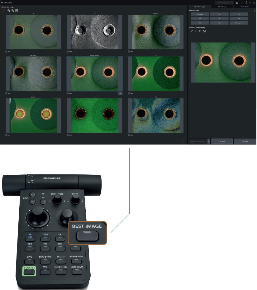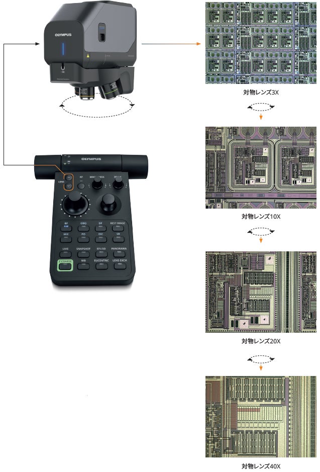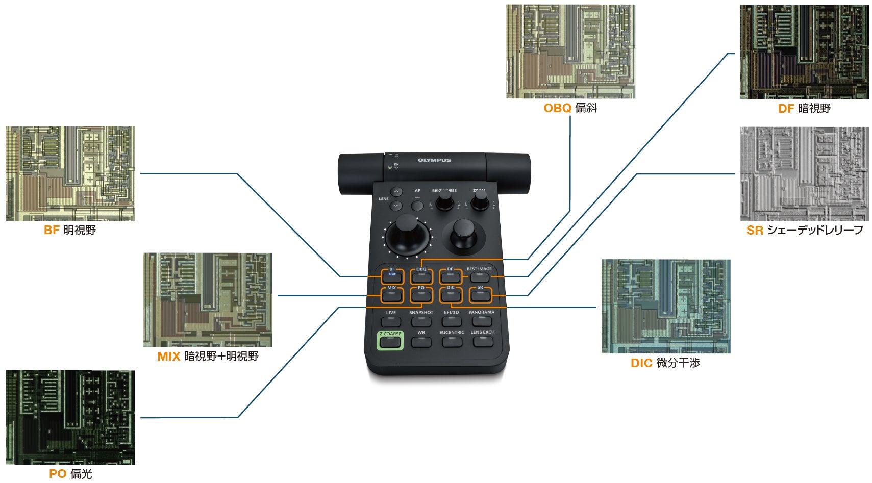 新開発の電動レボルバーユニットとコンソールにより、観察倍率や7種類の観察方法をボタンひとつで瞬時に切り替え可能で、サンプルに最適な観察法をすばやく選択できます。