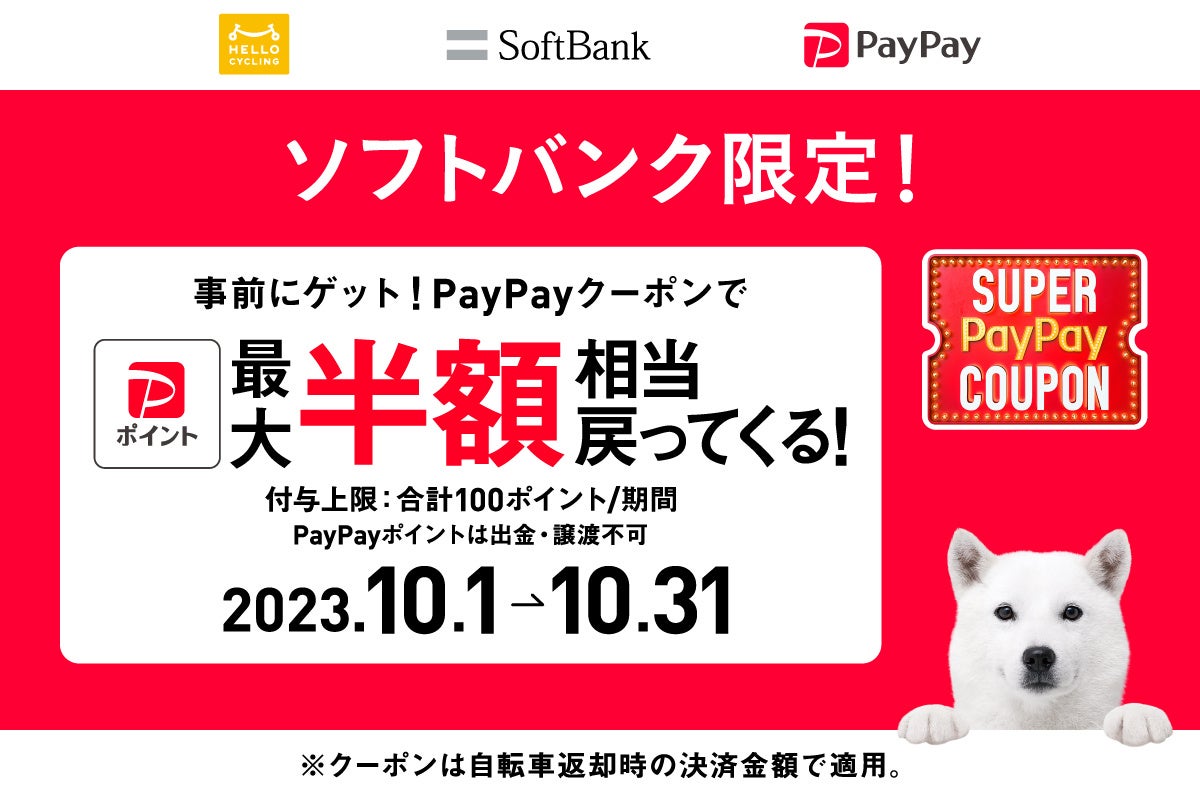 ソフトバンクユーザー限定*で、PayPayアプリ内で事前にクーポンを取得した後、「HELLO CYCLING」のご利用料金をPayPay経由でお支払いすると、決済金額の最大50%(付与上限:100ポイント/期間)のPayPayポイントが後日付与されます。