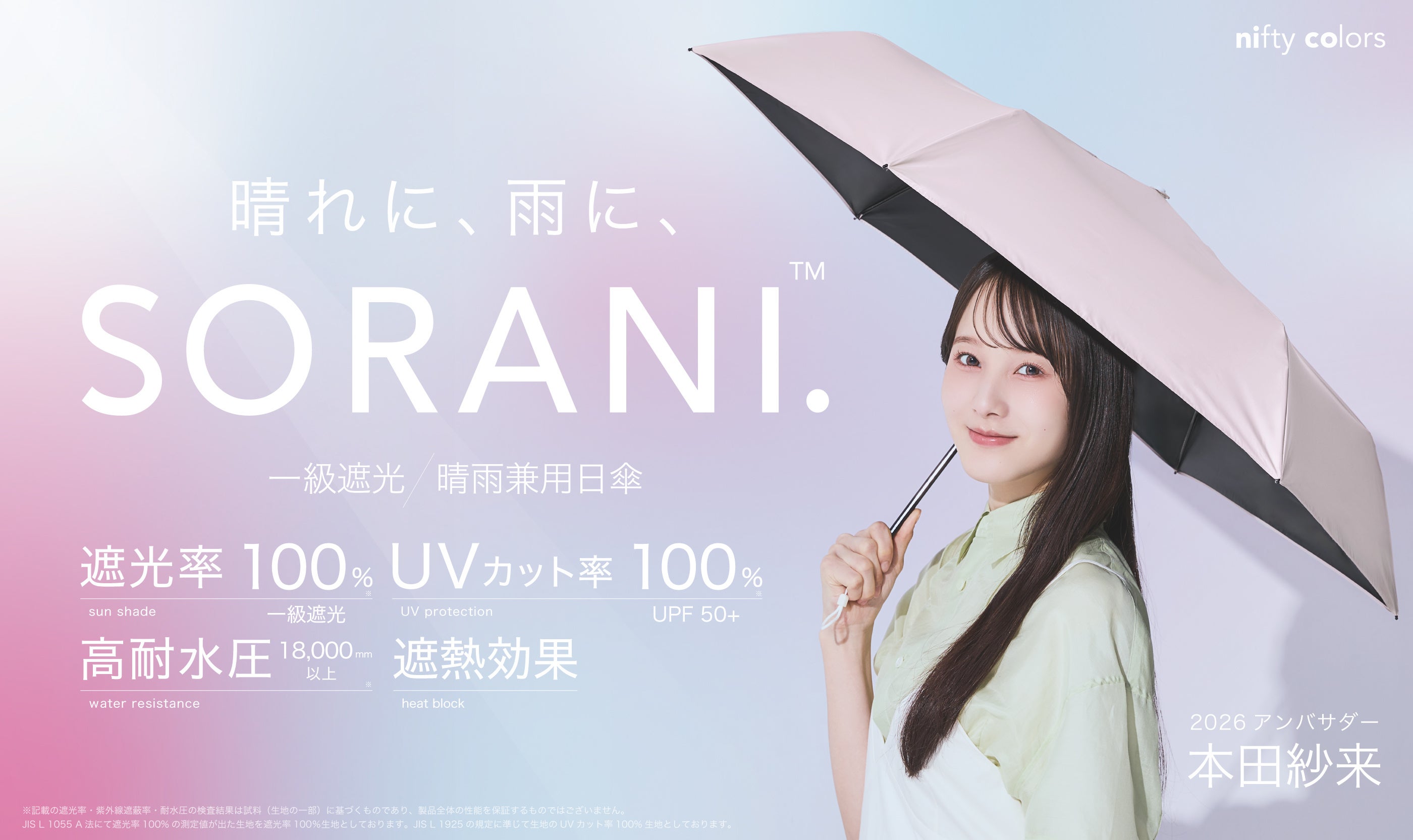 株式会社ニフティカラーズ(本社:東京都墨田区)は、2026年ブランドアンバサダーとしてモデルやタレントとして活躍する本田紗来さんを起用いたします。ユニセックス晴雨兼用遮光日傘ブランド「SORANI.」のムービー、「Pokella」「Memorilla」「Radi-Cool」のビジュアルを2026年3月2日(月)より公開いたしました。