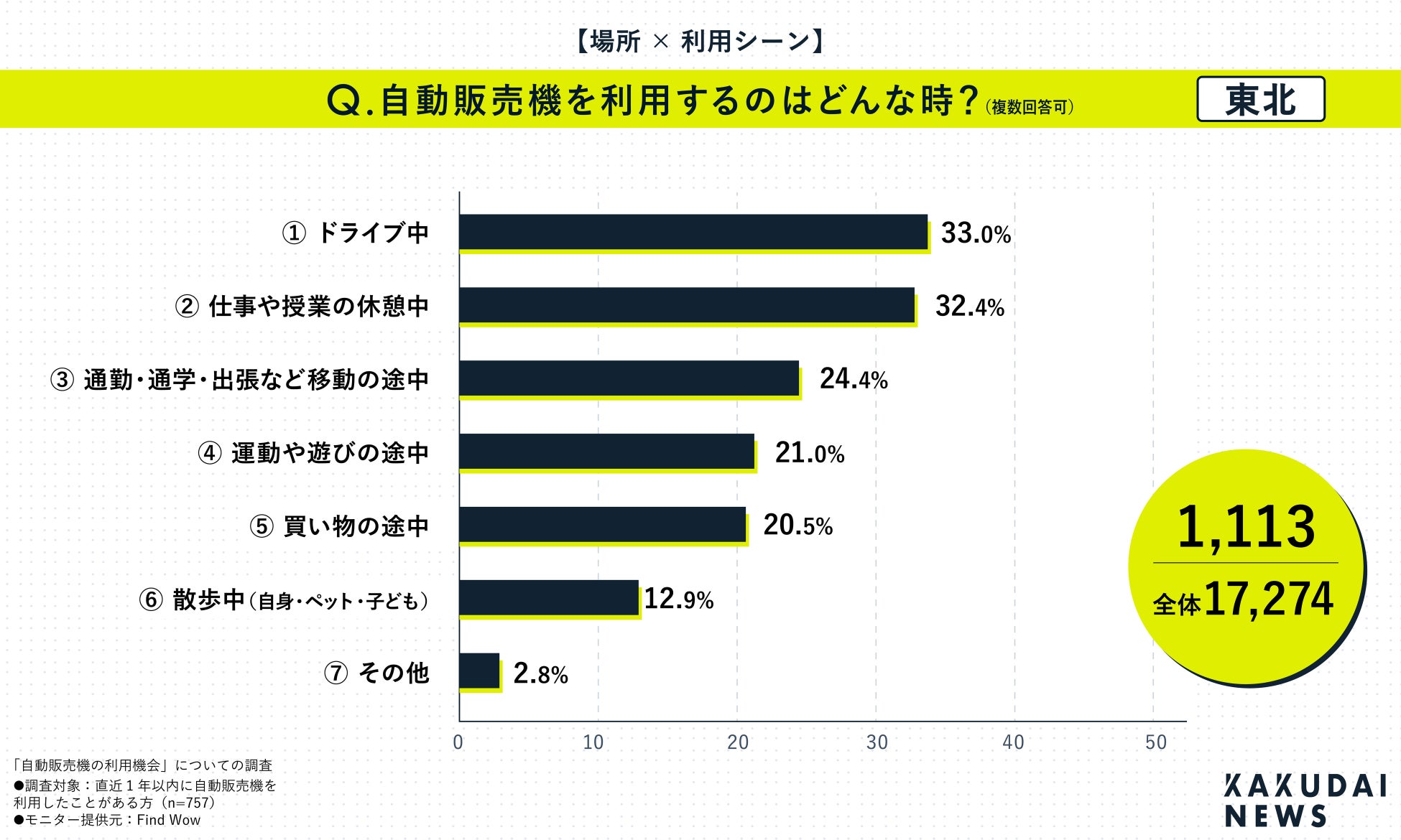 「東北エリア」では『ドライブ中(33.0%)』が1位で、全国でも最多の割合でした。