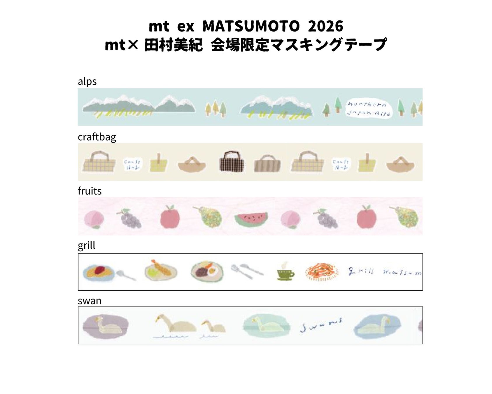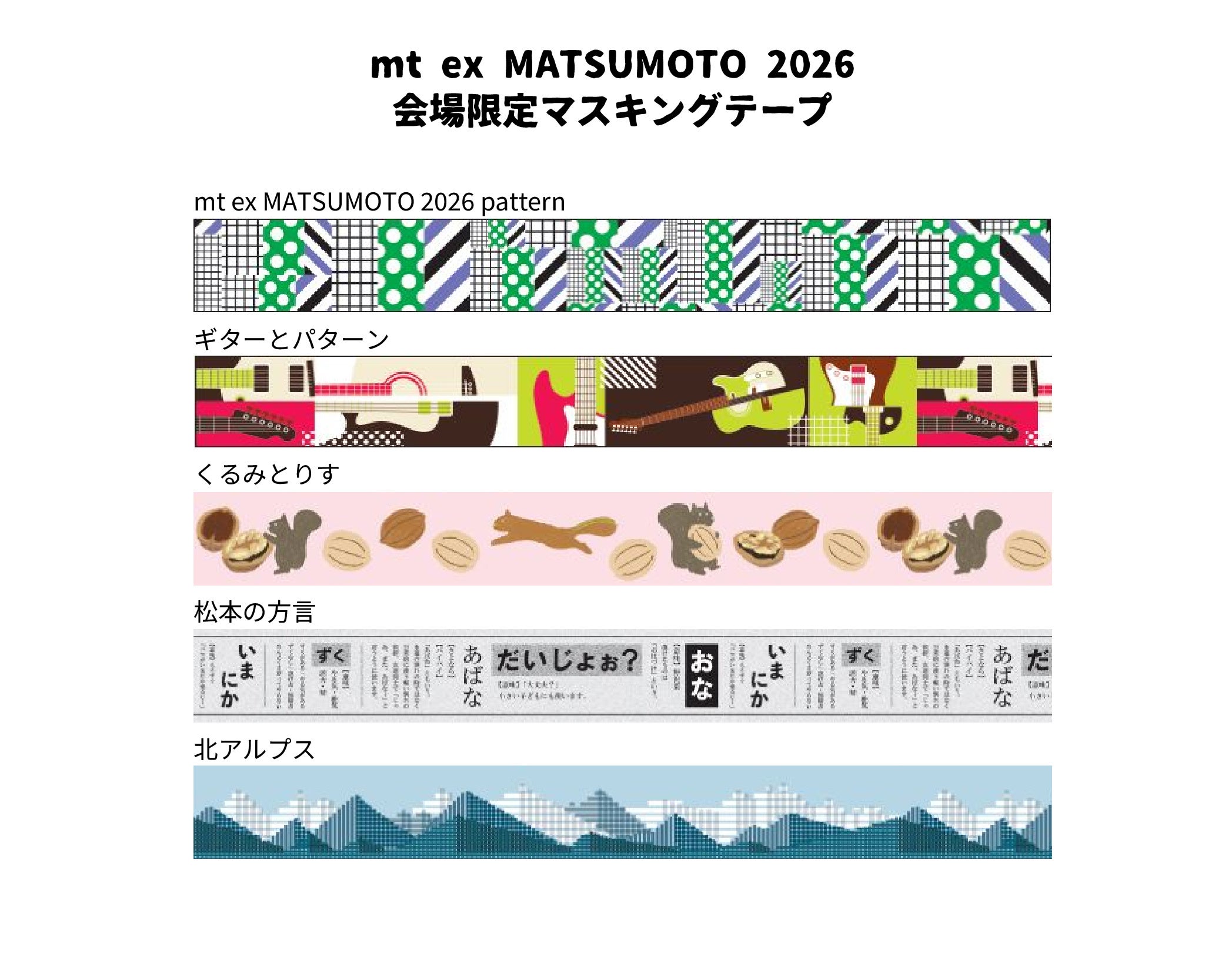 mtイベントでは、開催地域や会場にちなんだデザインのマスキングテープを期間限定で販売しています。今回は、信州の方言やアルプスの山々をモチーフにした会場限定テープが登場。さらに、長野県在住のちぎり絵作家・田村美紀が描く、長野をテーマにしたデザインも会場限定で販売します。