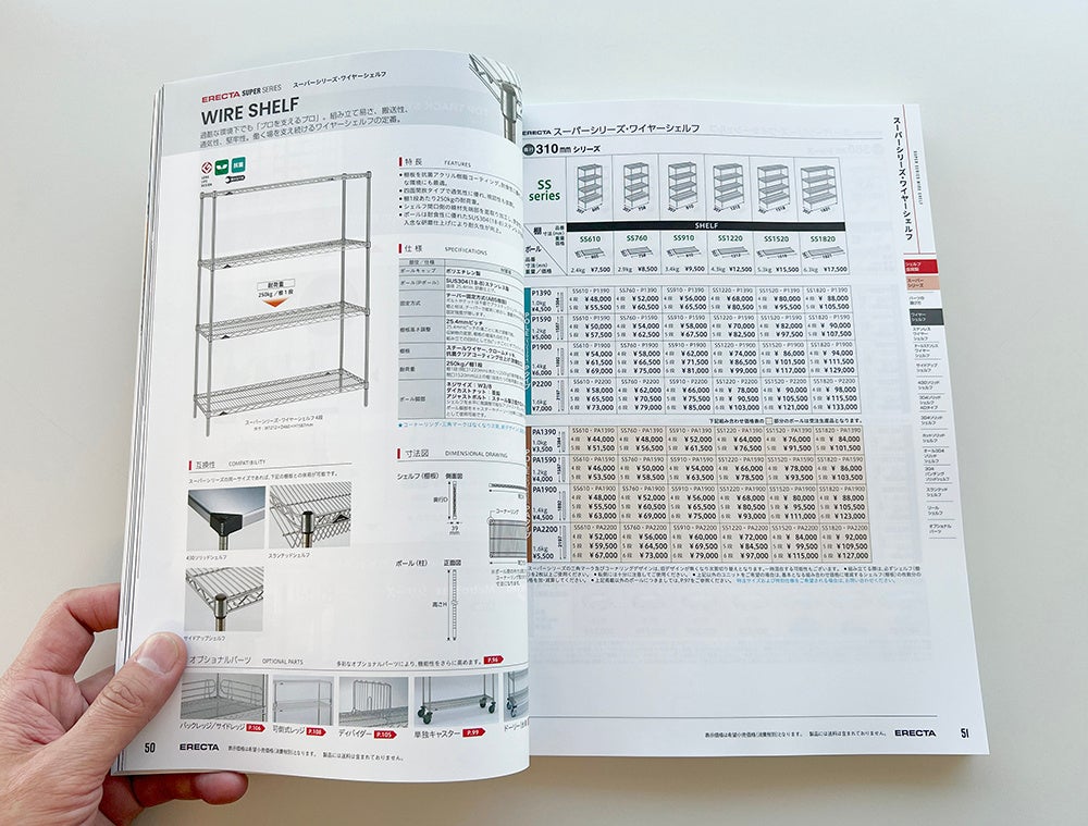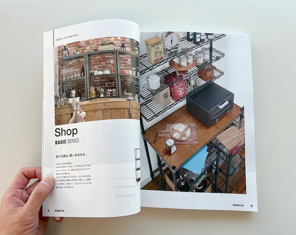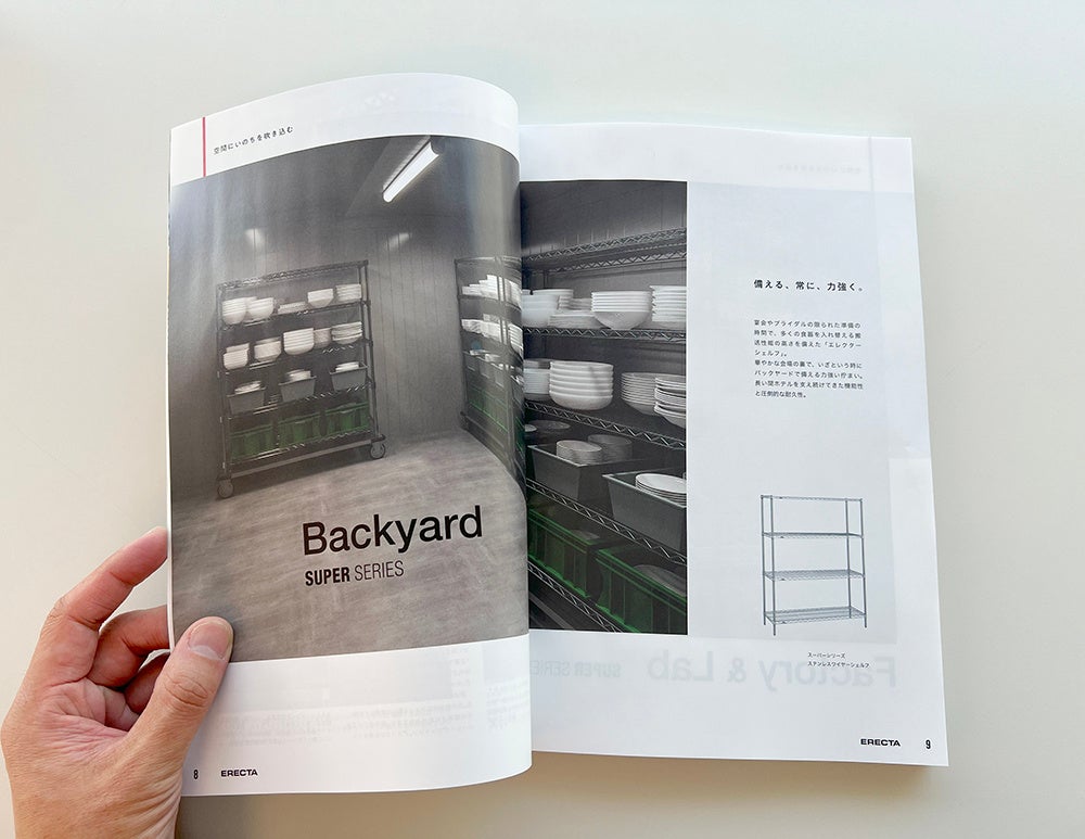 今回の総合カタログでは、より見やすく、より調べやすく、構成やレイアウトを工夫。今まで以上に製品を分かりやすく紹介しています。またエレクターの企業理念である、時を超える信頼=TIMELESS TRUSTを表現した表紙とし、長年にわたりエレクターシェルフをご使用いただいている店舗の事例を巻頭で掲載しています。