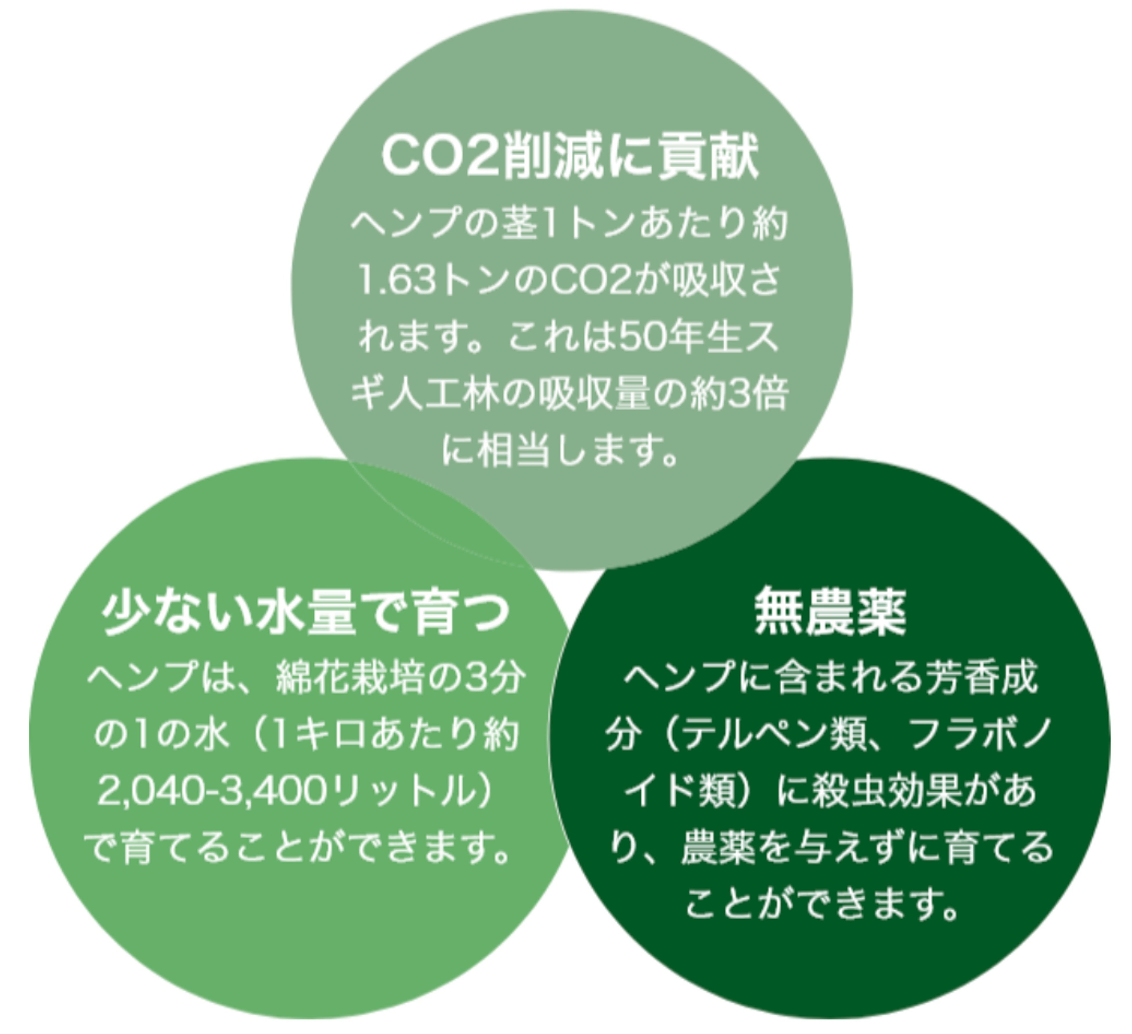 ①農薬・化学肥料が不要:ヘンプは害虫に強く、栽培時に農薬・化学肥料を使用する必要がない。