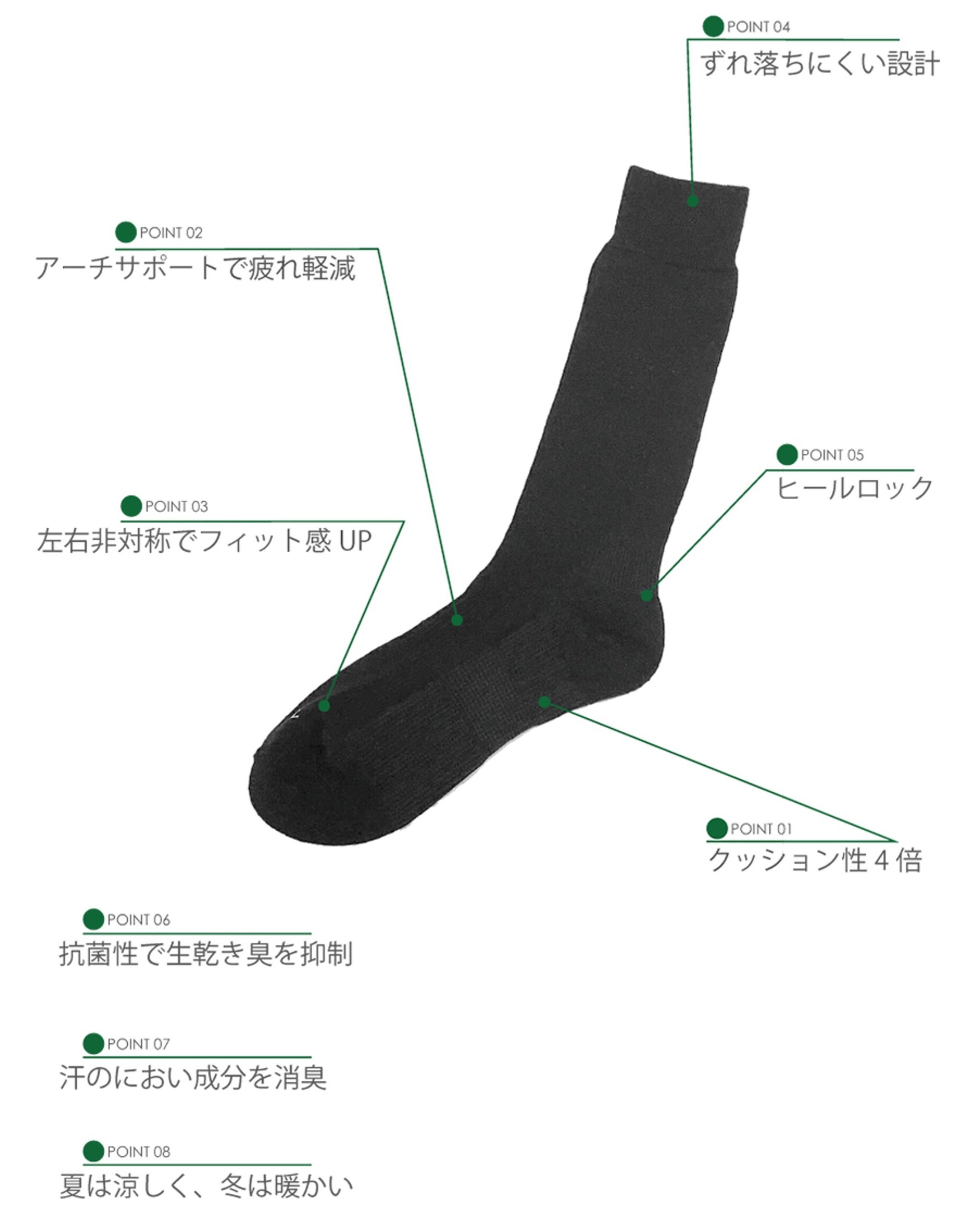 今回発売するソックスは、ヘンプの特徴を生かし「汗などのにおい成分を抑制する消臭性」「雑菌が繁殖しにくく清潔さを保つ抗菌性」「ムレによる不快感を軽減する吸湿性」を備え、これからの汗ばむ季節でも最適です。また、足裏には特許取得のクッション編みを採用し、靴下裏に無数の糸を出すことでインソールのような役割を果たし、通常の平編みと比べ4倍の衝撃緩和性となっています。加えて、かかとから土踏まずを支えているアーチ状の部分をテーピングのようにサポートすることで、足裏が固定され歩行時の疲れを軽減します。