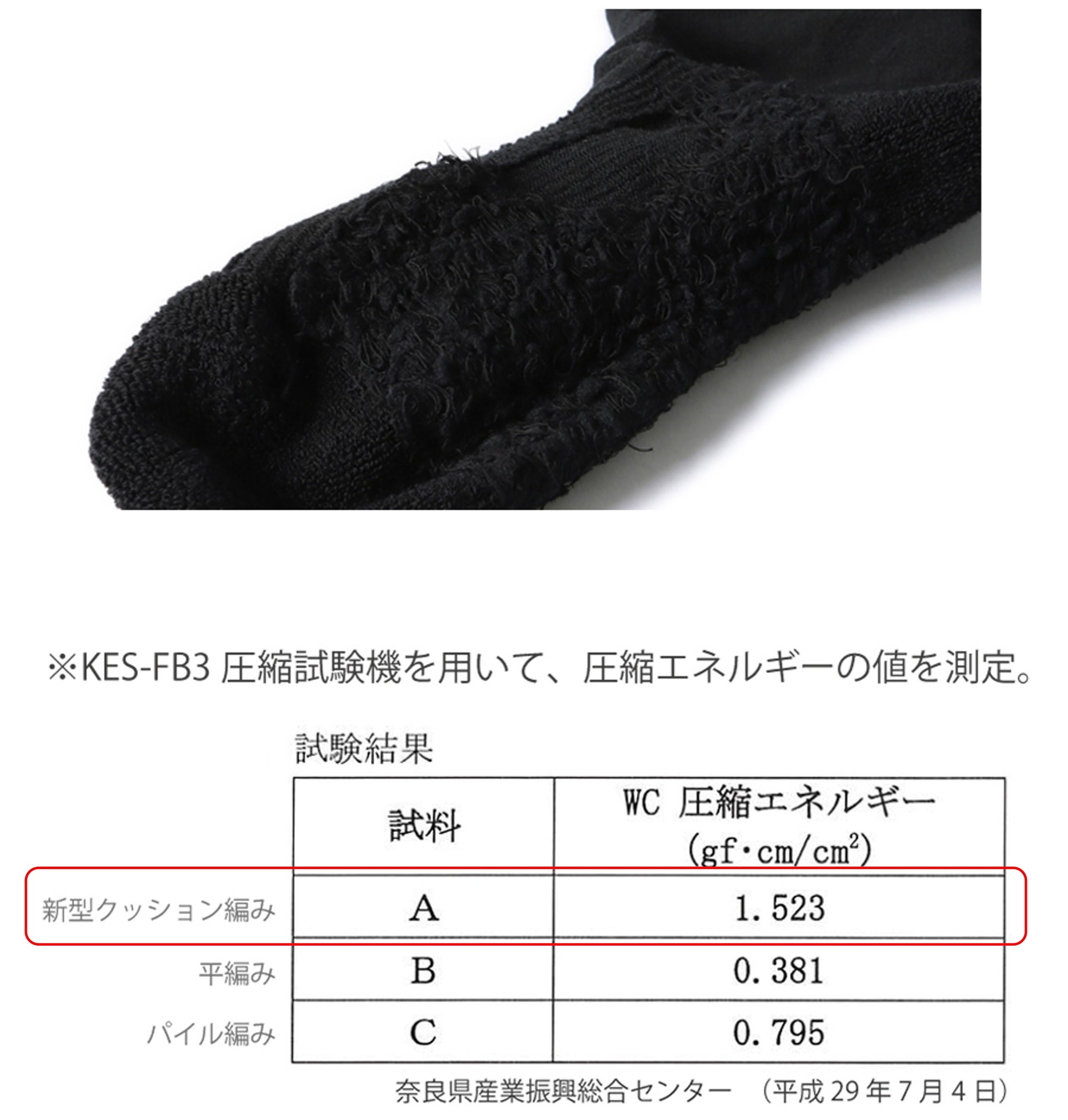 特許取得のクッション編みにより、衝撃緩和性が通常の平編みの4倍、パイル編みの2倍と長時間の歩行の疲れを軽減します。