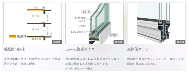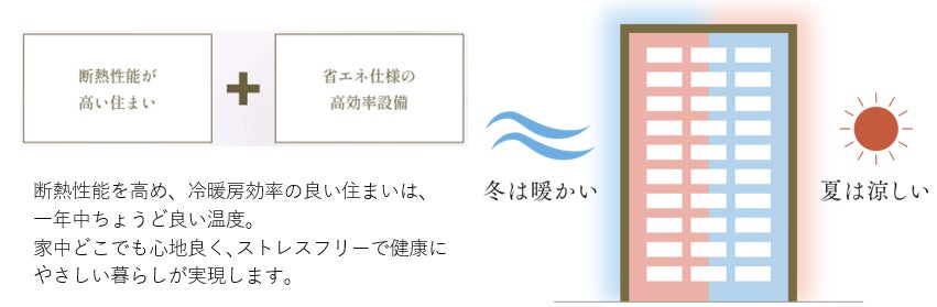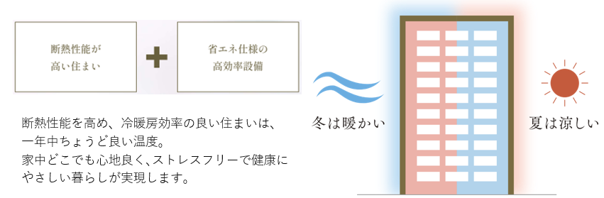 国土交通省では、2030年に目指すべき住宅の姿(あり方)として、「新築される住宅についてZEH基準の水準の省エネ性能が確保されること」としており、当社は分譲マンション「L’GENTE(ルジェンテ)」について前倒しでZEH基準の標準化を進め、快適で健康的かつ経済的な住まいの提供に努めております。