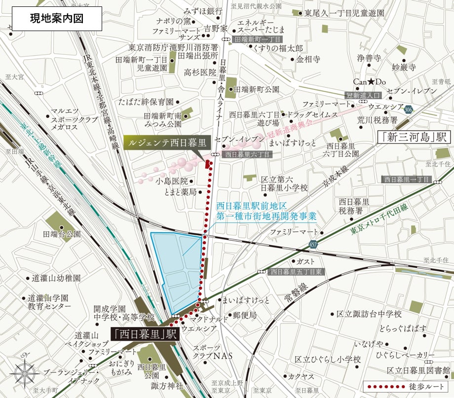 ルジェンテ西日暮里は、西日暮里駅前地区の再開発事業計画が決定し、これから新しく生まれ変わる西日暮里に立地、JR山手線・京浜東北線「西日暮里」駅徒歩6分、東京メトロ千代田線「西日暮里」駅徒歩5分、日暮里・舎人ライナー「西日暮里」駅徒歩4分、京成線「新三河島」駅徒歩8分を始めとした4駅5路線を利用し、都心の主要駅へは20分以内でダイレクトアクセスが可能です。