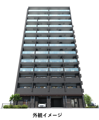 マンションの敷地は、2方向が通りに向けて開かれた開放感のある角地で、空間が開けたコーナー部分には植栽帯を設け、桜並木の冠新道への入口となる緑の風景をつくります。