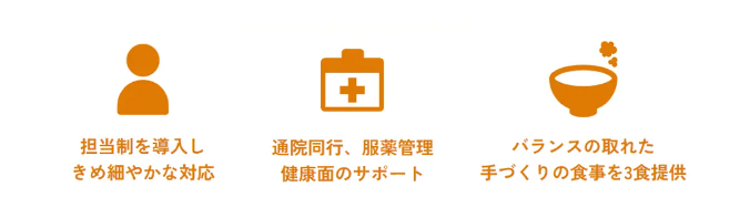 ・ご利用者様の健康状態を把握した職員が主治医と連携し、その時々の状態に合わせた健康サポートを行います