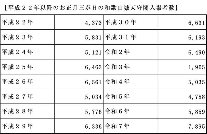 和歌山市のシンボルである和歌山城天守閣のお正月三が日の入場者数は7,895人で、平成22年以降、過去最多となりました。