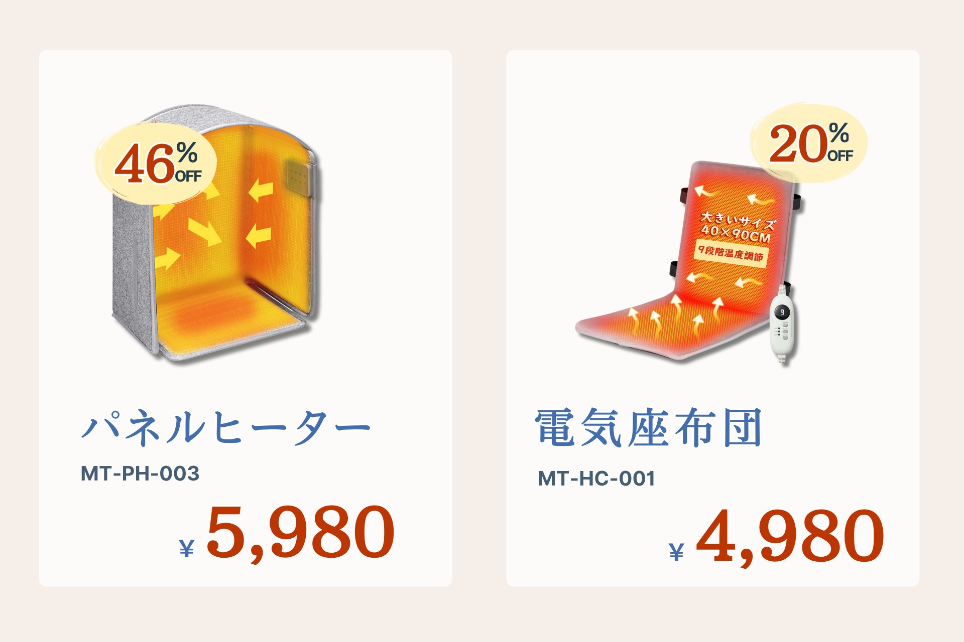 足元からじんわり温めてくれるパネルヒーターと、座るだけで体をほぐすような温もりが広がる電気座布団は、「頭寒足熱」の理想的な環境を作り、長時間のデスクワークやリラックスタイムをより快適にしてくれます。