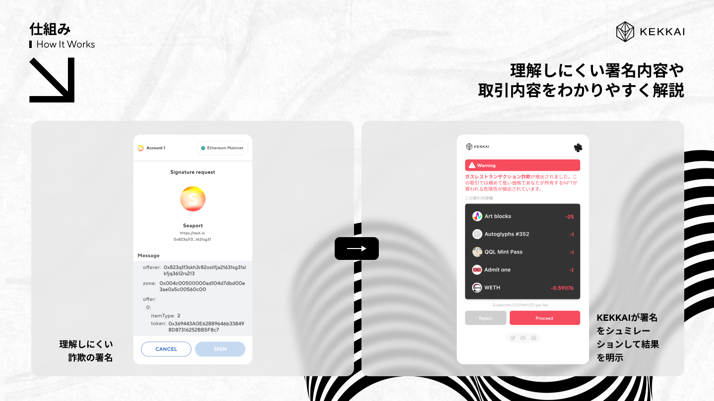 現在、ユーザー向けにトランザクションのシュミレーション分析により危険検知ができるPC専用Web3セキュリティツール「KEKKAI Plugin」、セキュリティ機能搭載ブラウザアプリ「KEKKAI Mobile」を運営中。