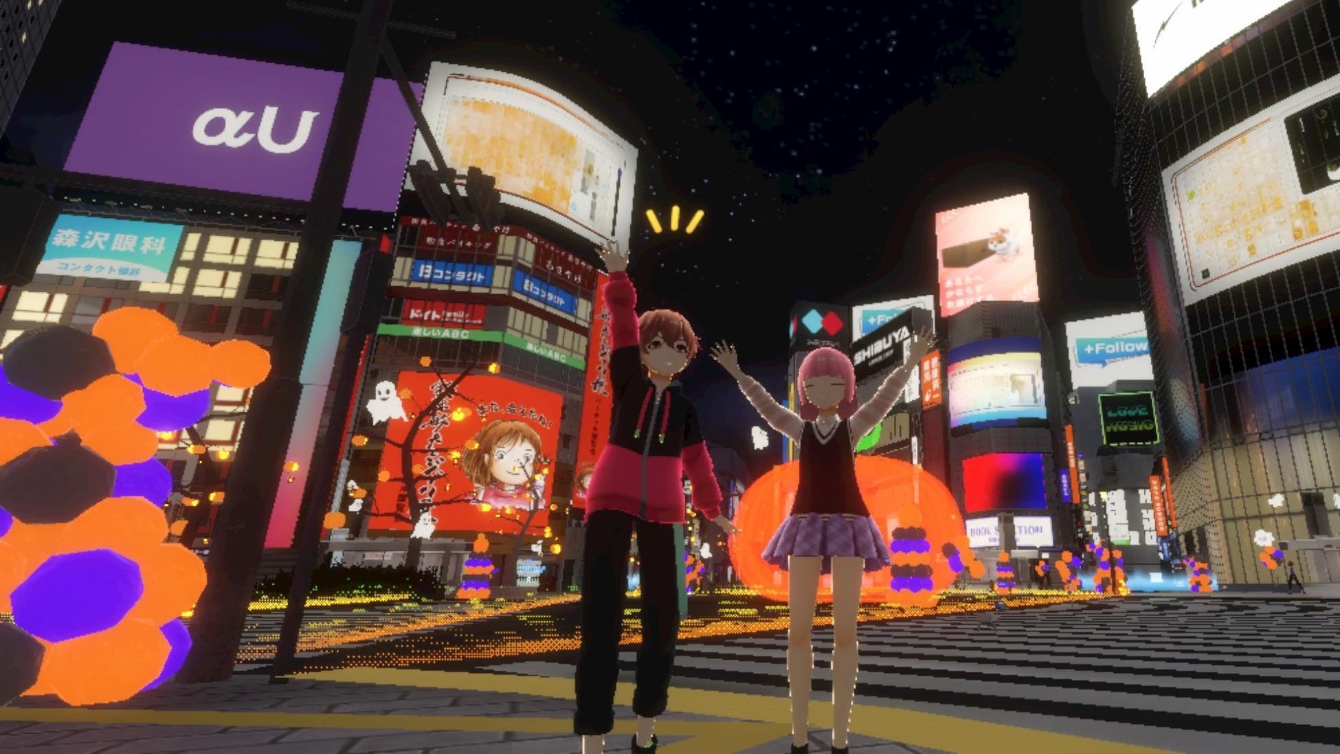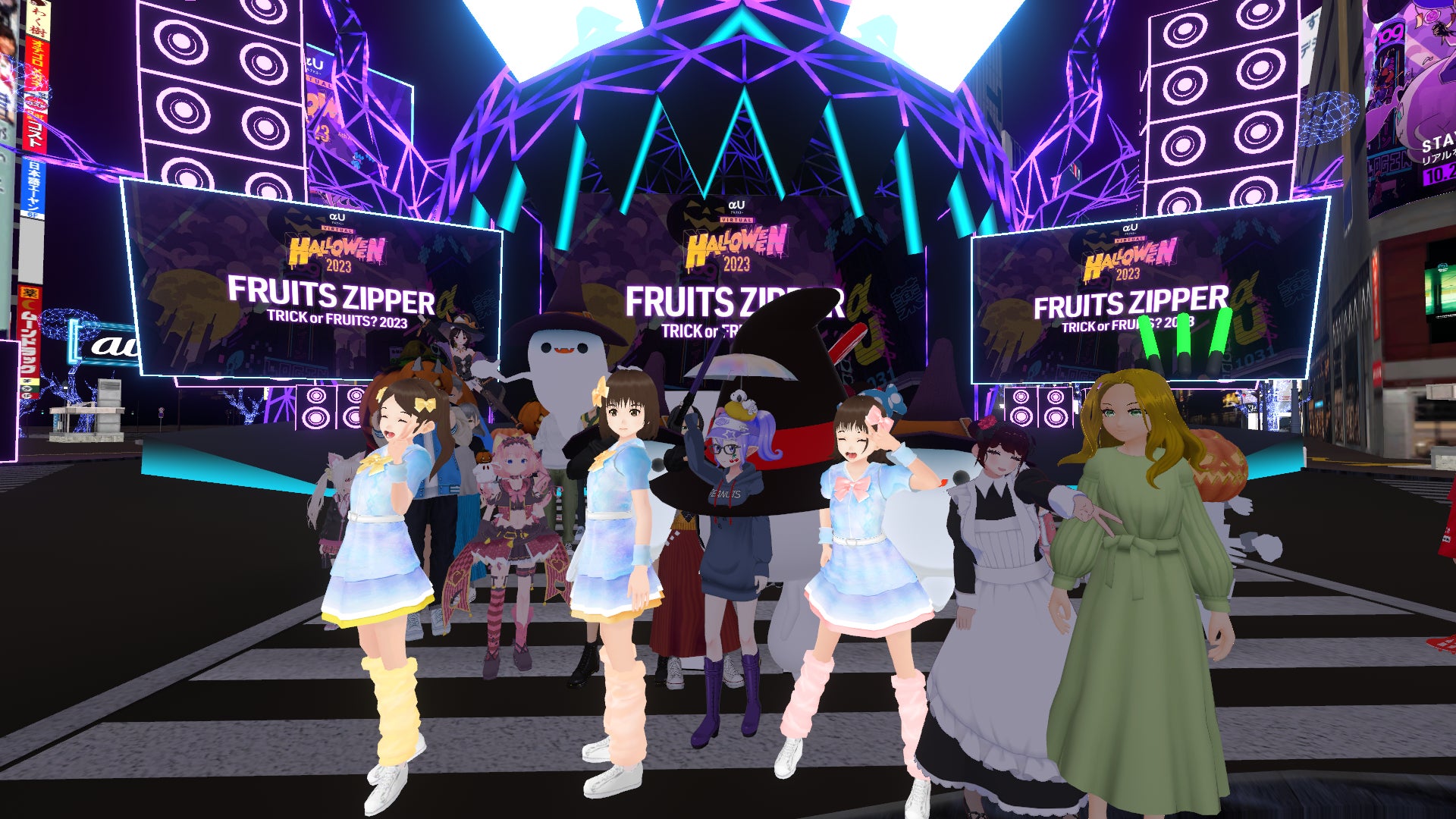 7人組アイドルFRUITS ZIPPERから月足天音さん、鎮西寿々歌さん、早瀬ノエルさんが2年連続で「バーチャル渋谷」に登場。さらに、KDDIが提供するメタバースアプリ「αU metaverse」には櫻井優衣さん、仲川瑠夏さん、真中まなさん、松本かれんさんが登場し、ハロウィーンの夜に、2つのメタバースでファンと交流する時間を楽しみました。 「αU metaverse」内では、「ファンに会うまで帰れません!」企画にチャレンジ。メタバース内でたくさんのふるっぱー(FRUITS ZIPPERのファンの総称)と交流ができ、メンバーは「普段のイベントと違い、ファンじゃない人ともメタバースで出会えて、知ってもらうことができてよかったです!」と大満足の様子でした。最後は「ハッピーハロウィーン♪」と言う掛け声とともにファンミーティングの幕が閉じました。