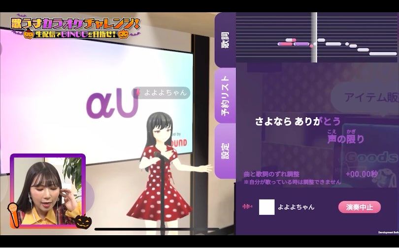 スピードワゴン・井戸田潤さんをMCに迎え、令和の歌まねヒロイン・よよよちゃんさん、カリスマボイストレーナーとしてYouTubeで活躍する【歌唱力向上委員会】のおしらさん、チャンネル登録者数180万人超え2人組YouTuber・パパラピーズさん、R-1グランプリ2022王者のお見送り芸人・しんいちさんと、各界から歌に自信のある方々がカラオケBINGOに挑戦。生配信中にカラオケ点数を競い合うBINGOチャレンジだけでなく、令和の歌まねヒロイン・よよよちゃんがメタバースアプリ「αU metaverse」に新しく登場した「カラオケボックスαU」を初体験しました。街が混雑する時期に”メタバースでカラオケ”という新しいハロウィーンの楽しみ方を提案しました。