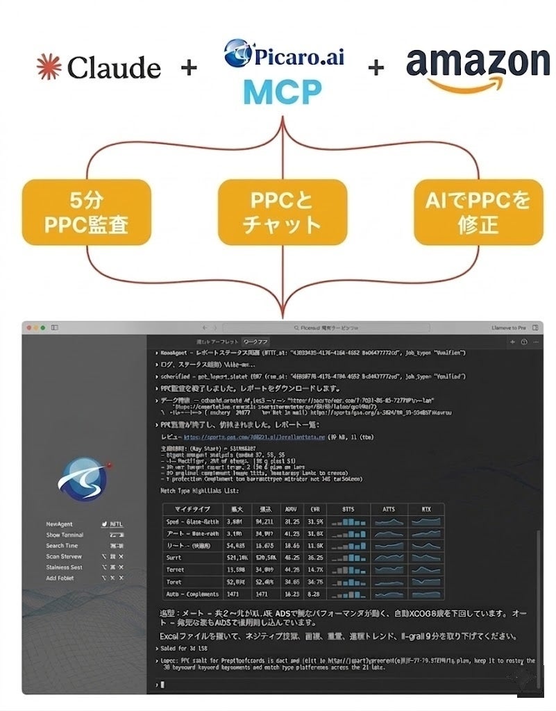 株式会社Picaro.ai(本社:神奈川県横浜市みなとみらい、代表取締役:下平季位)は、Amazon広告分析・運用プラットフォーム「Picaro.ai」において、有料プランへのAIエージェント機能の実装、ならびに外部パートナー向けMCP(Model Context Protocol)の公開を発表いたします。これにより、Amazonセラーや広告代理店は、自社データとAIを組み合わせた高度な意思決定・広告運用を、より手軽に実現できるようになります。